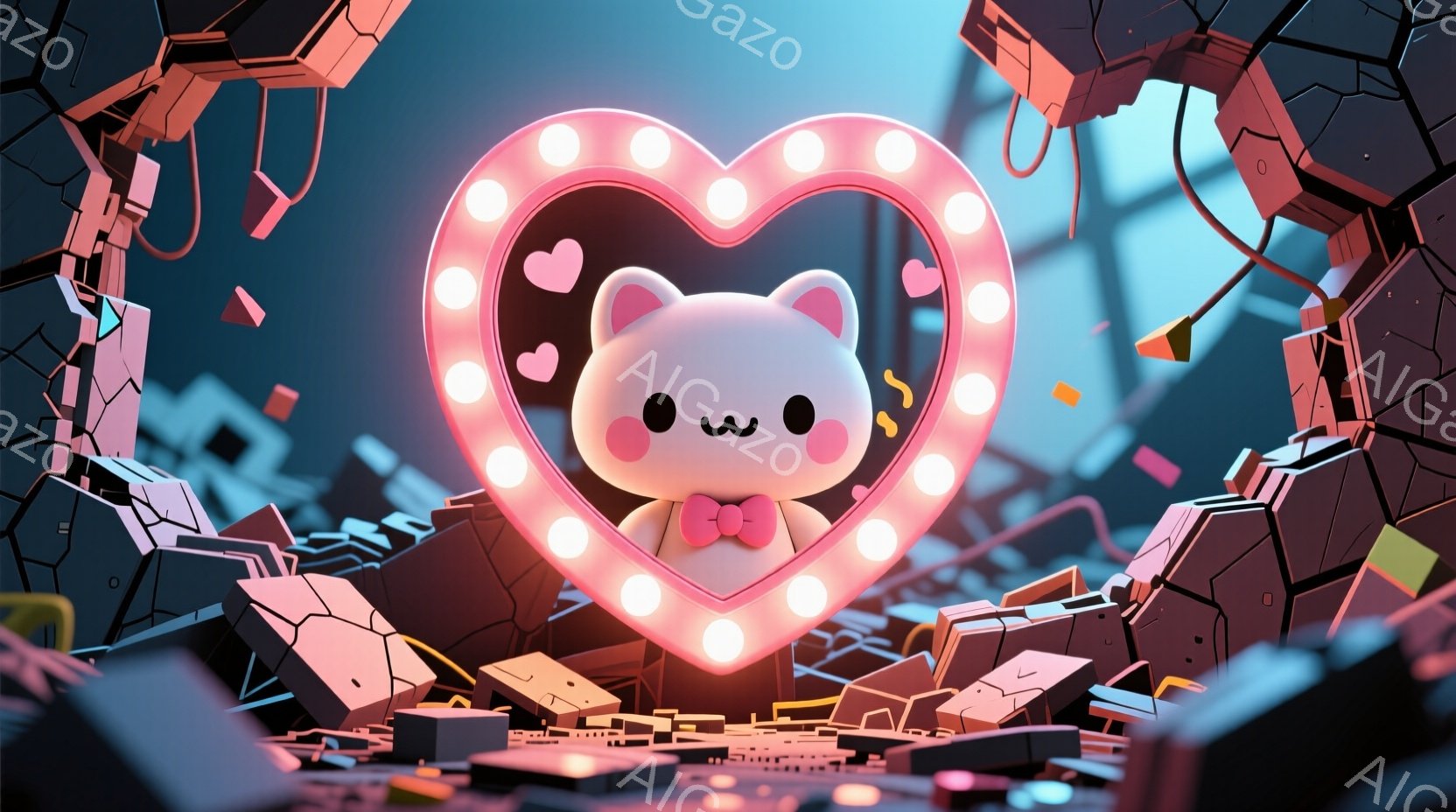 白い猫のようなキャラクターが、ピンク色の電球で飾られたハート型のフレームの中に立っています。キャラクターは赤い蝶ネクタイを着用し、笑顔で、とても可愛らしい表情をしています。背景には、崩壊した建物のような角ばったオブジェクトが散乱しており、少し不穏な雰囲気ながらも、明るいピンクのフレームが可愛らしさを際立たせています。