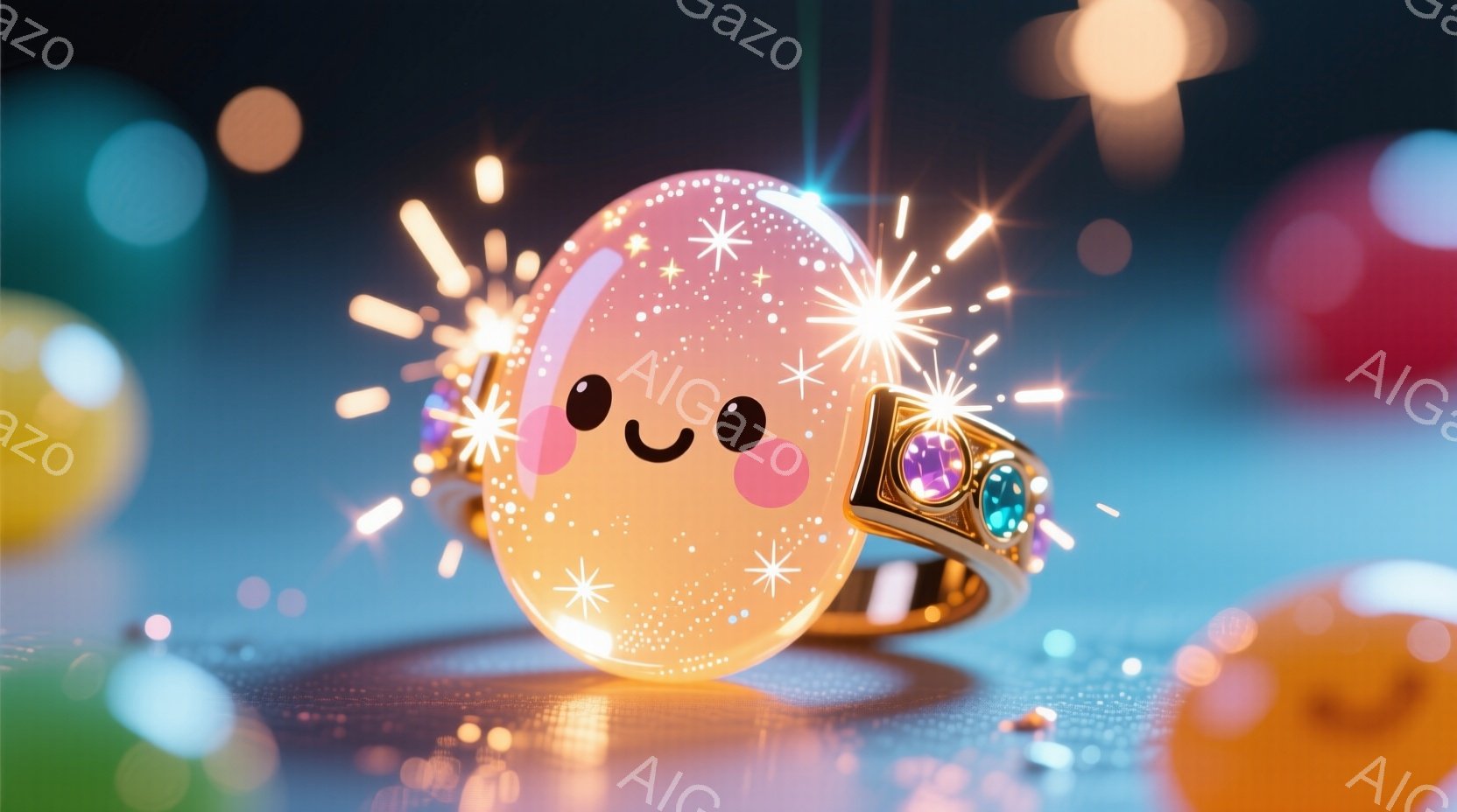 輝く黄色の卵のようなキャラクターが、キラキラと光る青色の背景に浮かんでいます。可愛らしい表情で、頬は赤く、黒い丸い目が特徴です。背景には、ぼやけた色の球体や光の粒子が散りばめられ、ファンタジーで夢幻的な雰囲気を醸し出しています。