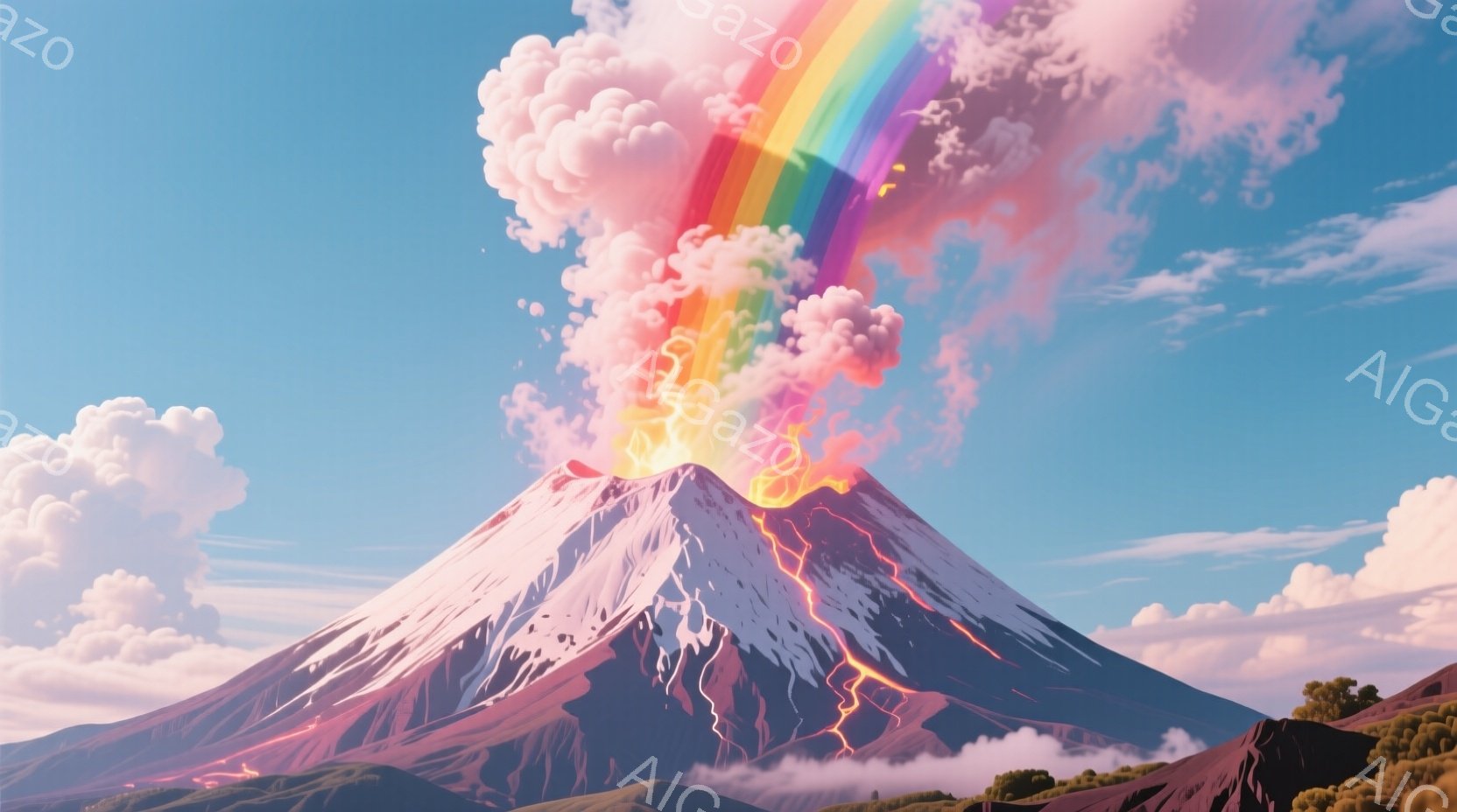 雄大な山が画面を占め、雪を頂いた山頂から厚い雲が立ち上っています。雲は赤、オレンジ、黄色、緑、青、藍色、紫と美しい虹色に輝き、幻想的な光景を作り出しています。山の麓には緑豊かな植物が広がり、穏やかな空の下、壮大な自然の美しさが表現されています。