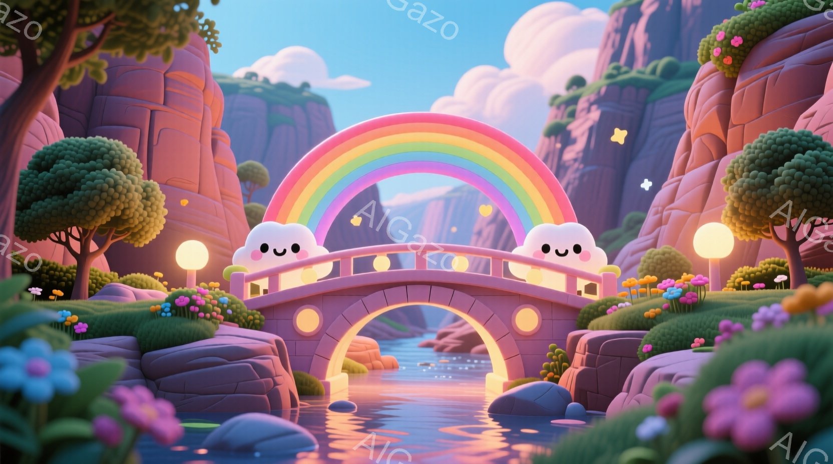 カラフルなアーチ状の橋が、穏やかな水面に架かっています。橋の両端には、笑顔の雲のキャラクターが立っており、周囲は緑豊かな植物と岩場に囲まれ、空には虹がかかっています。全体的に、暖かく、夢のような、牧歌的な雰囲気です。