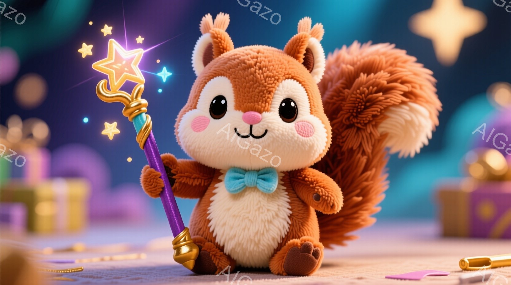 この無料AI生成画像「ふわふわの茶色のリスが、紫色のリボンと青い蝶ネクタイをつけています。右手に金色の星のついた魔法の杖を持ち、明るい笑顔を浮かべています。背景には草地、花、遠くにはファンタジー風の建物が見え、星が散りばめられた夜空が幻想的な雰囲気を醸し出しています。」は、2025年10月23日に作成されました。 サイズは 1664×928px の高解像度で、商用利用も可能なフリー素材として提供しています。