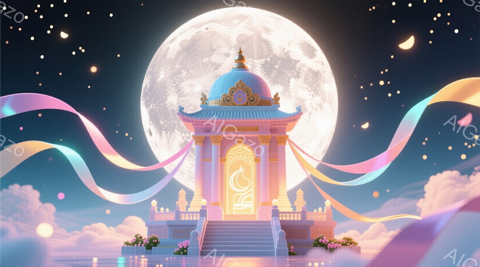 壮大な宮殿のような建物が、夜空に浮かぶ満月を背景に荘厳に佇んでいます。宮殿は淡いピンク色で、繊細な彫刻とアーチが特徴的で、周囲にはリボンや植物が配置され、幻想的な雰囲気を醸し出しています。夜空には星が輝き、雲が流れ、全体的に夢幻的でロマンチックな印象を与えます。