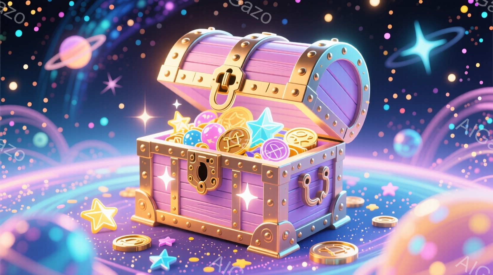 鮮やかな紫色の宝箱が開いており、中には金色のコインや青い宝石、星形のクリスタルが輝いている。背景は星空と惑星で彩られ、ファンタジーの世界観を強調している。宝箱の周りには、同様の金貨や宝石が散らばっており、夢のような雰囲気を醸し出している。