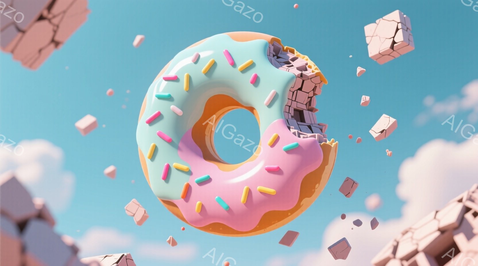 空を背景に、ピンク色のアイシングがかかったドーナツが浮遊している様子が描かれています。ドーナツの一部は割れており、内部のオレンジ色の生地が見えています。背景には、立方体のようなオブジェクトや、ぼやけた雲のようなものが散りばめられており、夢のような、遊び心のある雰囲気を醸し出しています。