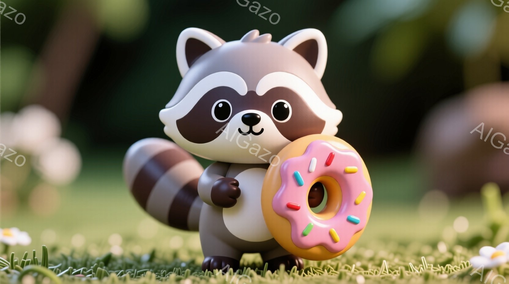 アライグマのキャラクターが、ピンク色のアイシングとカラフルなスプリンクルが施されたドーナツを抱えています。緑色の芝生の上で、幸せそうな表情で正面を見つめており、背景はぼやけた自然の風景です。全体的に明るく、愛らしい雰囲気で、遊園地やテーマパークのキャラクターのような印象を与えます。