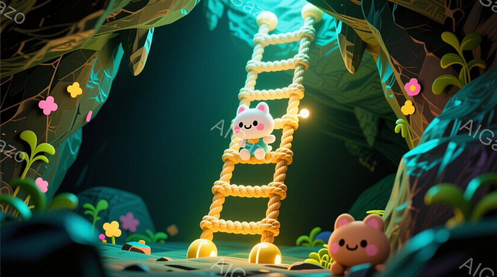 この無料AI生成画像「白くて丸いキャラクターが、黄色いロープの梯子を登っています。背景は鮮やかな青と紫の抽象的な地形で、黄色いドット状のオブジェクトや緑色の植物が点在し、ファンタジーのような雰囲気を作り出しています。全体的に、明るくポップな色彩と丸みを帯びた形状が特徴的な、かわいらしいイラストレーションです。」は、2025年10月23日に作成されました。 サイズは 1664×928px の高解像度で、商用利用も可能なフリー素材として提供しています。
