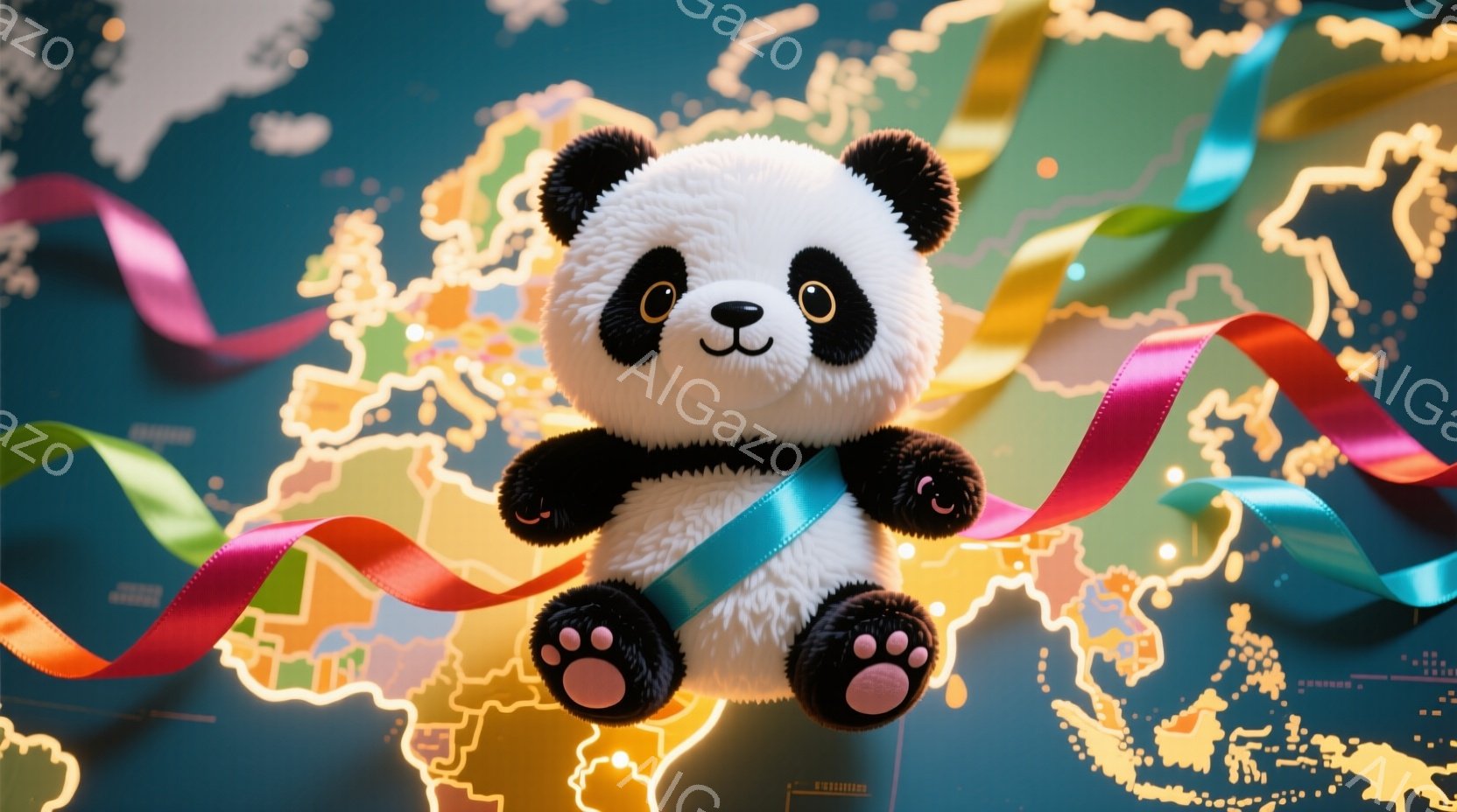 ぬいぐるみのようなパンダが、世界地図を背景に座っています。パンダはオレンジ色のリボンで結ばれ、頭上と足元には緑と赤のリボンが付いた装飾が浮いています。世界地図は鮮やかなネオンカラーで描かれ、全体的に明るく、お祝いの雰囲気が漂っています。