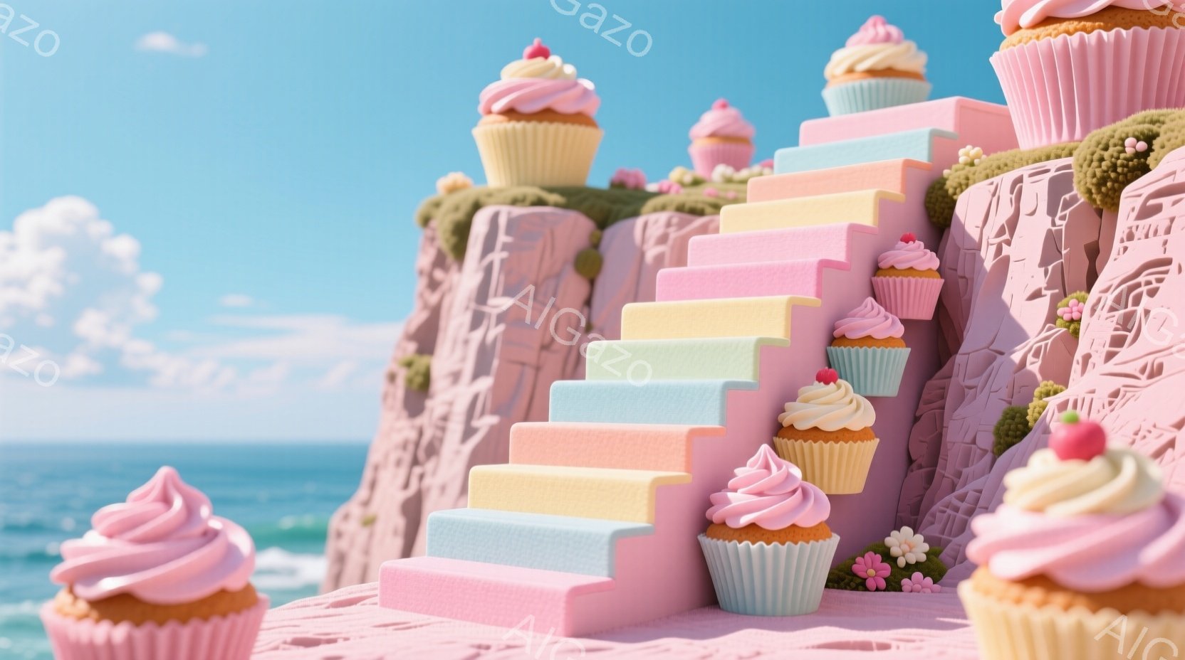 明るいピンクとパステルカラーで構成された、まるで夢のような風景です。階段は虹色に染まり、その上に可愛らしいカップケーキが所々に配置されています。背景には青い海と崖が見え、全体的に甘くて優しい雰囲気が漂っています。