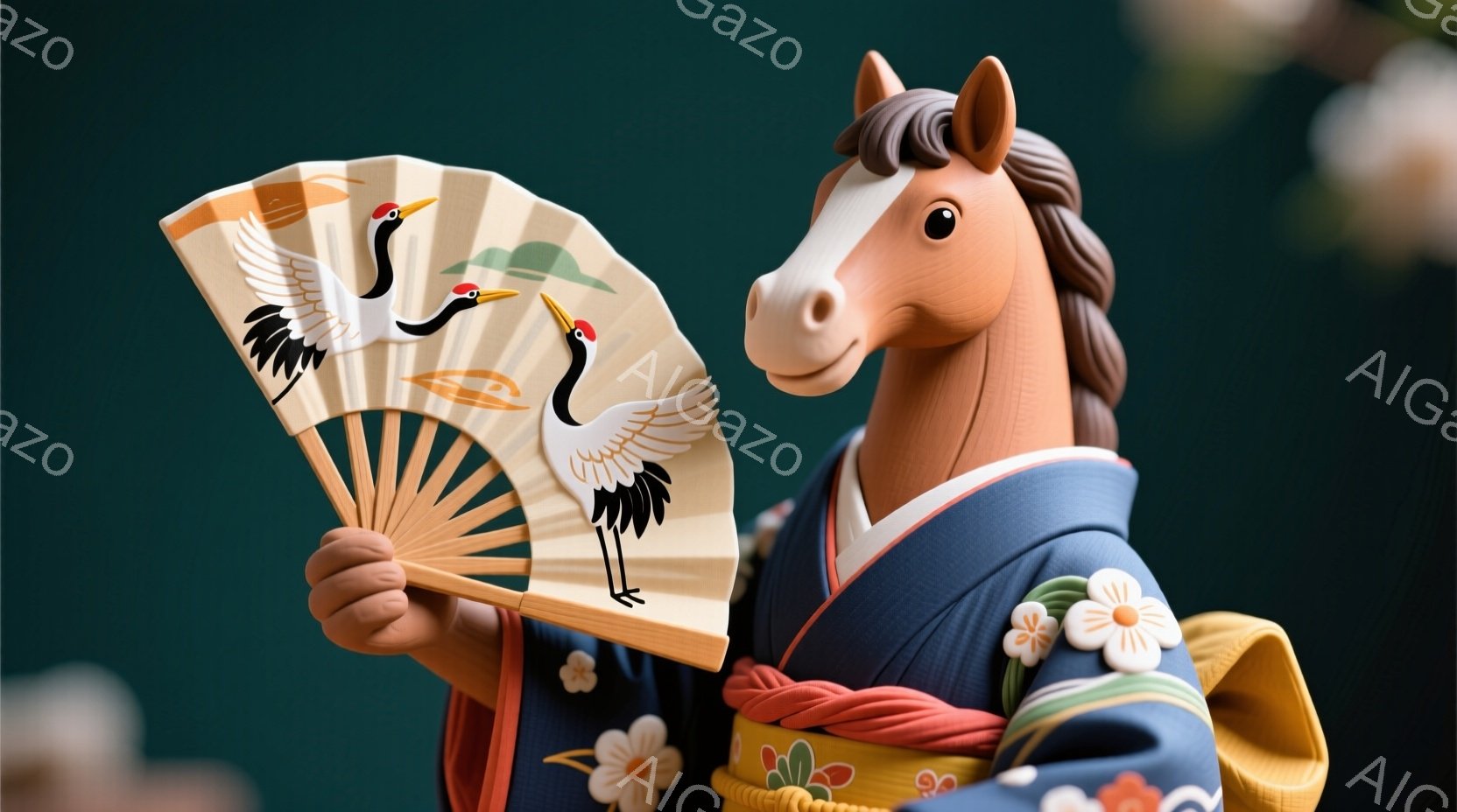 濃い緑色の着物を着た馬が描かれており、着物には大きな黄色い花が散りばめられています。馬は片手に扇子を持ち、扇子には鶴が描かれています。背景にはぼやけた盆栽があり、全体的に落ち着いた雰囲気で、日本の伝統的な美しさを表現しています。
