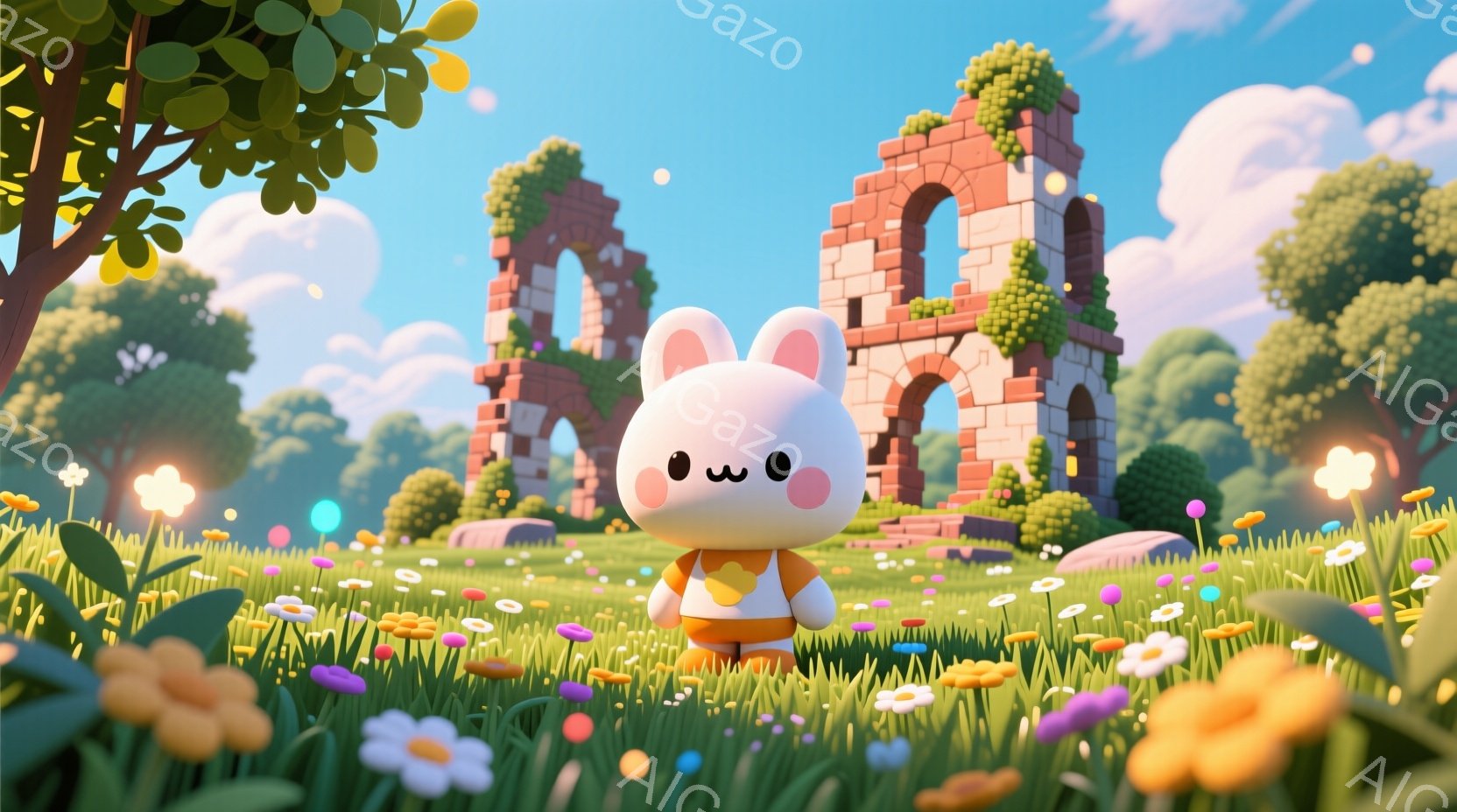 可愛らしいウサギのキャラクターが、緑豊かな花畑の中に立っています。パステルピンクの服を着ており、頭にはオレンジ色のリボンが付いたバタフライモチーフの髪飾りをつけています。背景には、蔦が絡まるアーチ状の廃墟と、穏やかな青空、そして緑の丘が見え、全体的に暖かく、夢幻的な雰囲気を醸し出しています。