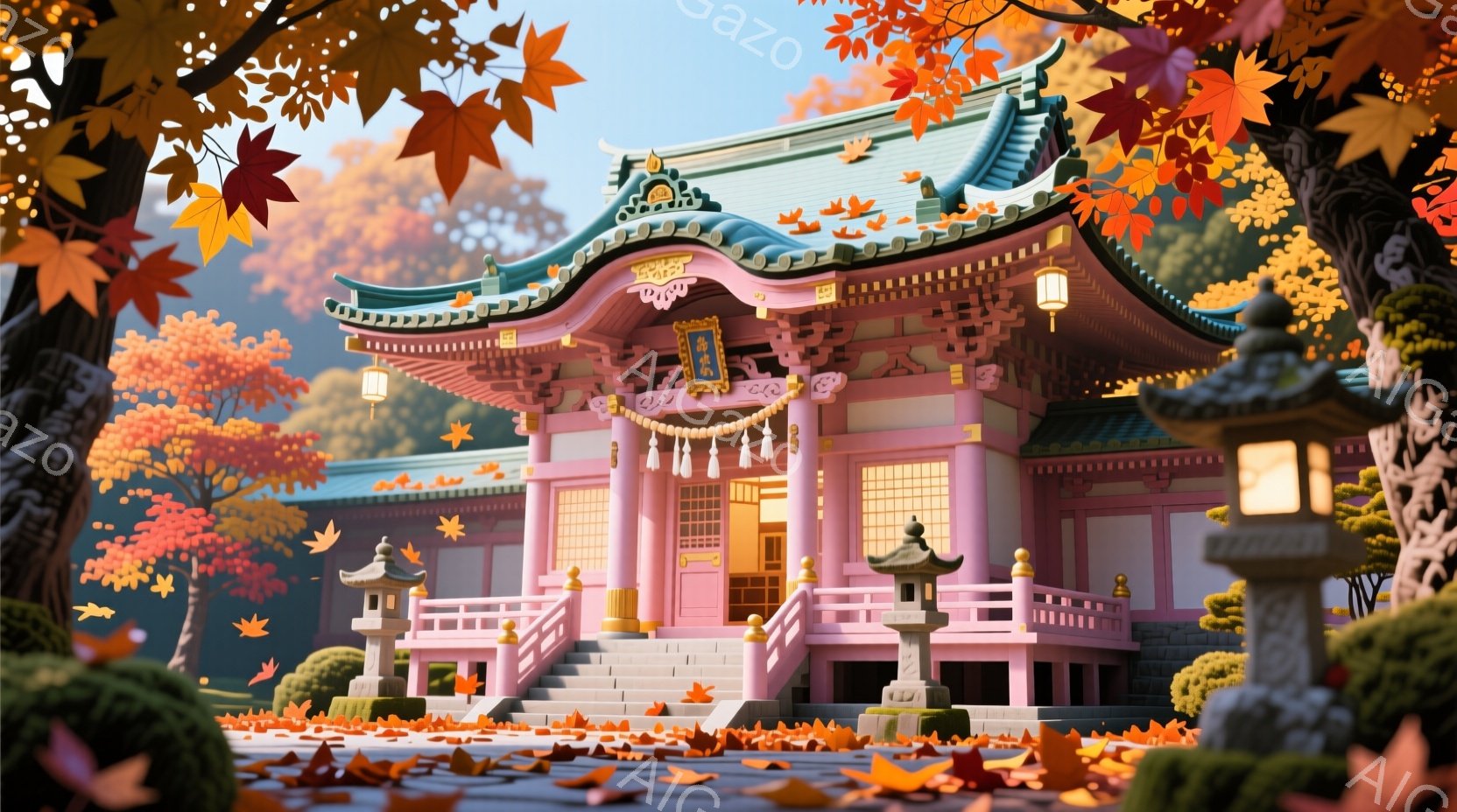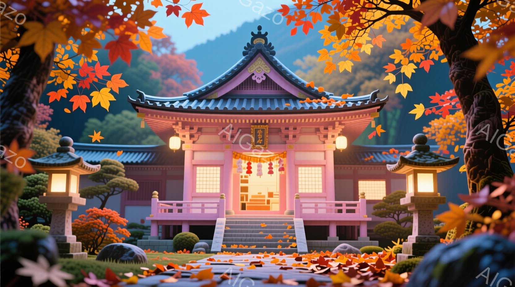 鮮やかな朱色の寺院が、紅葉に彩られた庭園に佇んでいます。寺院は整然と手入れされた庭木と石畳の道に囲まれ、温かい光が内部から漏れ出し、穏やかな雰囲気を醸し出しています。秋の夕暮れ時を思わせる、美しい情景です。