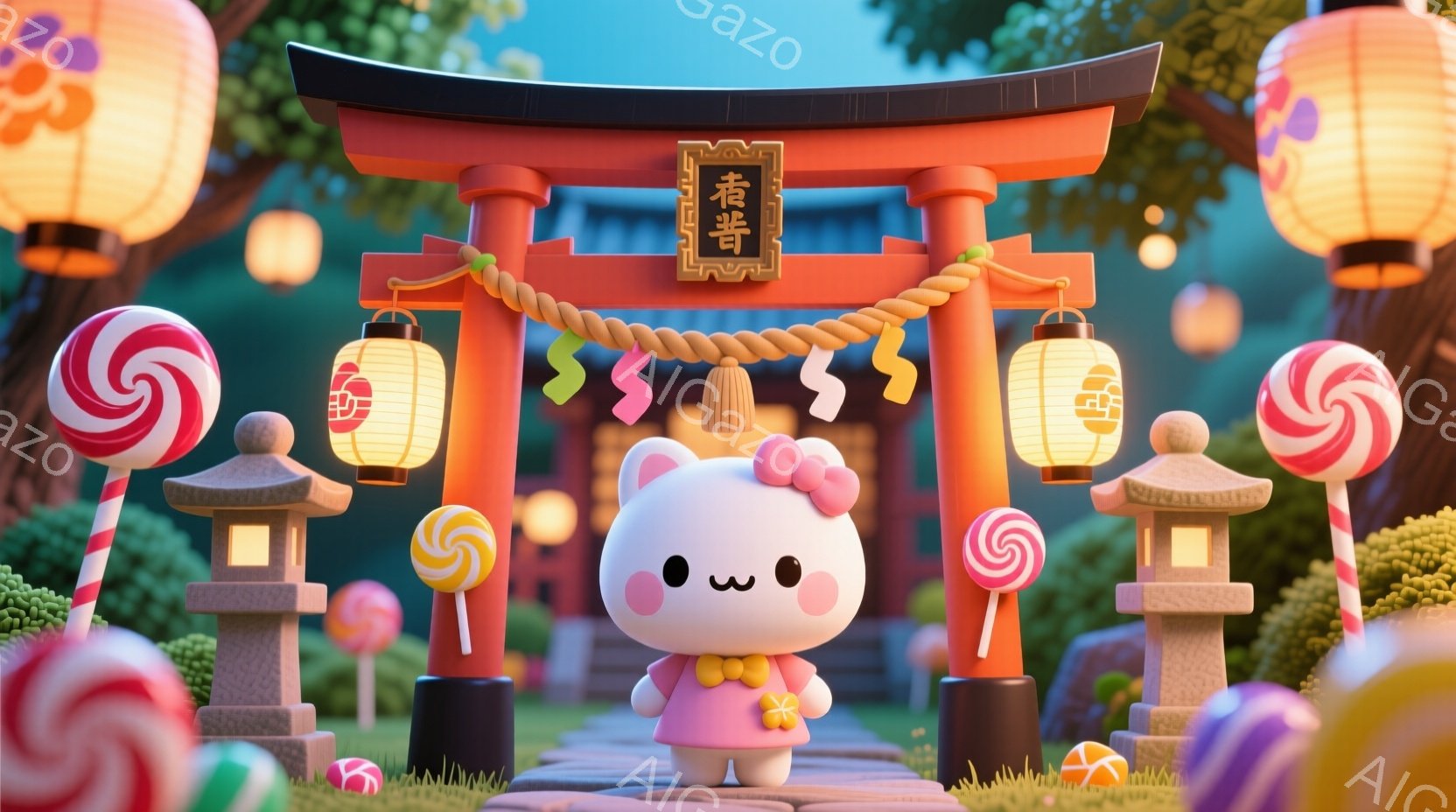 キティちゃんが赤い鳥居の前で立っているイラストです。白いシャツに赤いオーバーオールを着ており、可愛らしい笑顔を浮かべています。背景には緑豊かな草地、カラフルなキャンディ、そして柔らかな光が差し込む穏やかな空が広がっています。