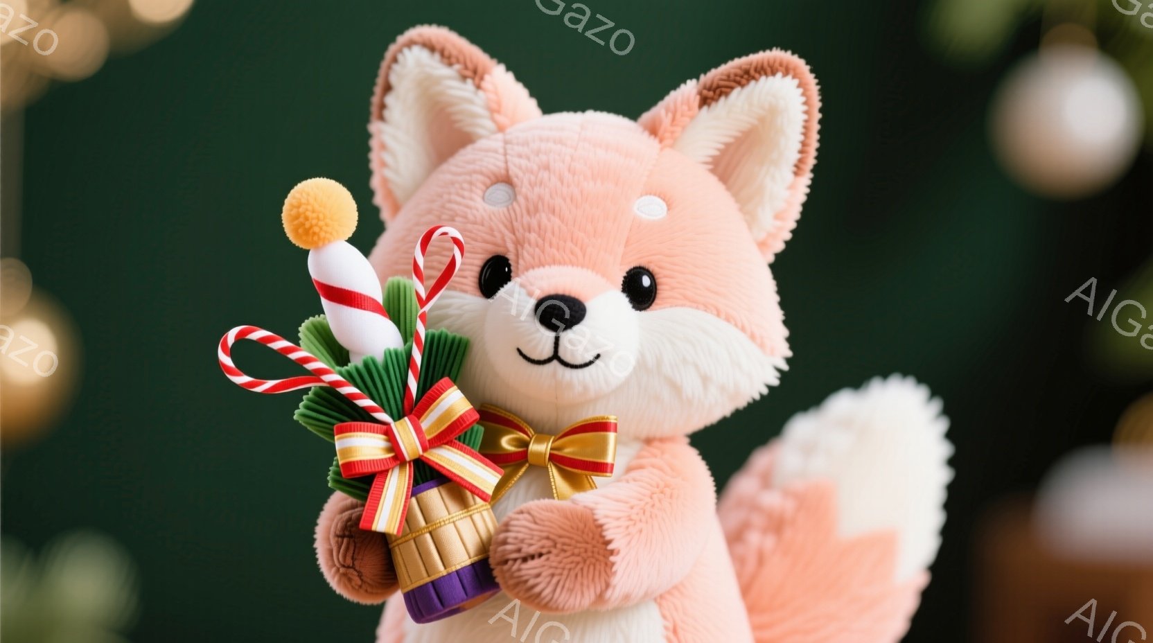 明るいピンク色のふわふわしたキツネのぬいぐるみです。赤いリボンと金の縁取りが施された、可愛らしい蝶ネクタイをつけています。左手には、ピンクのリボンで飾られた緑の植物の束(おそらく新年のお祝いの飾り)を持っています。