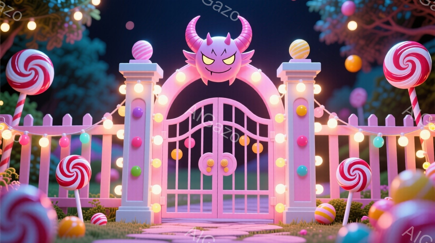 鮮やかなピンク色の装飾が施された門が、キャンディやカラフルな球体で飾られた庭の入り口に立っている。門の上部には月型の装飾があり、周囲には小さな電球が連なり、幻想的な雰囲気を醸し出している。背景には緑豊かな草地と木々が広がり、おとぎ話のような甘い世界を連想させる。