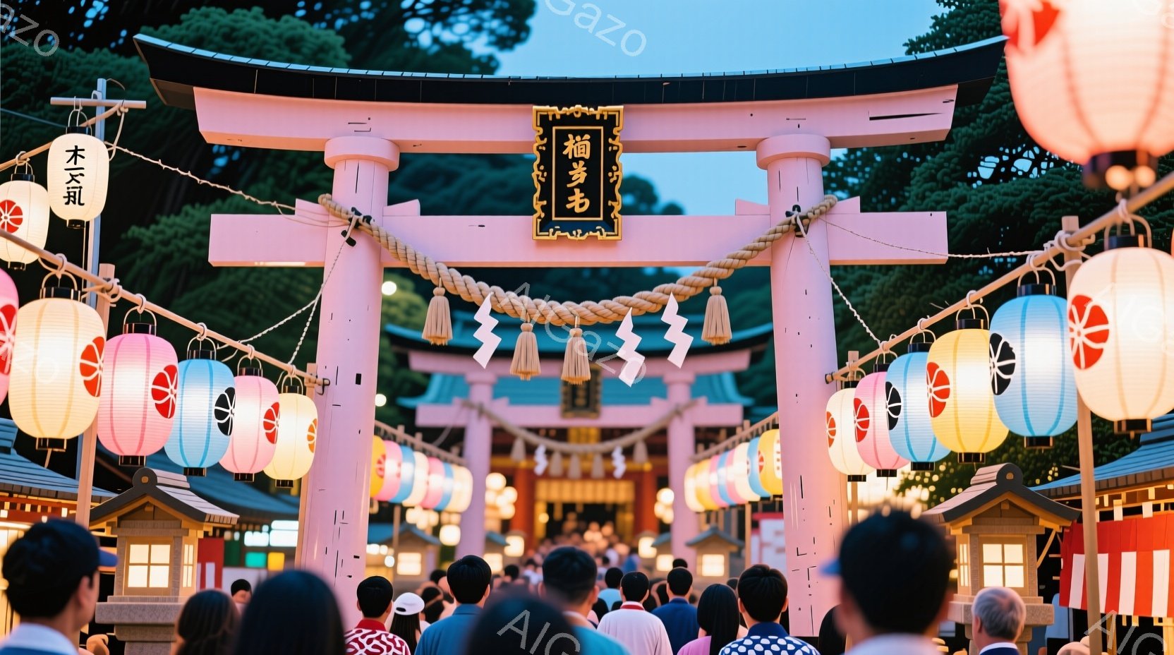 鮮やかな朱色の鳥居が、賑やかな祭りの風景を映し出している。多くの人々が浴衣や普段着を着ており、楽しげな雰囲気が伝わってくる。背景には木々が見え、夕暮れ時の空と提灯の明かりが、温かく幻想的な空間を作り出している。