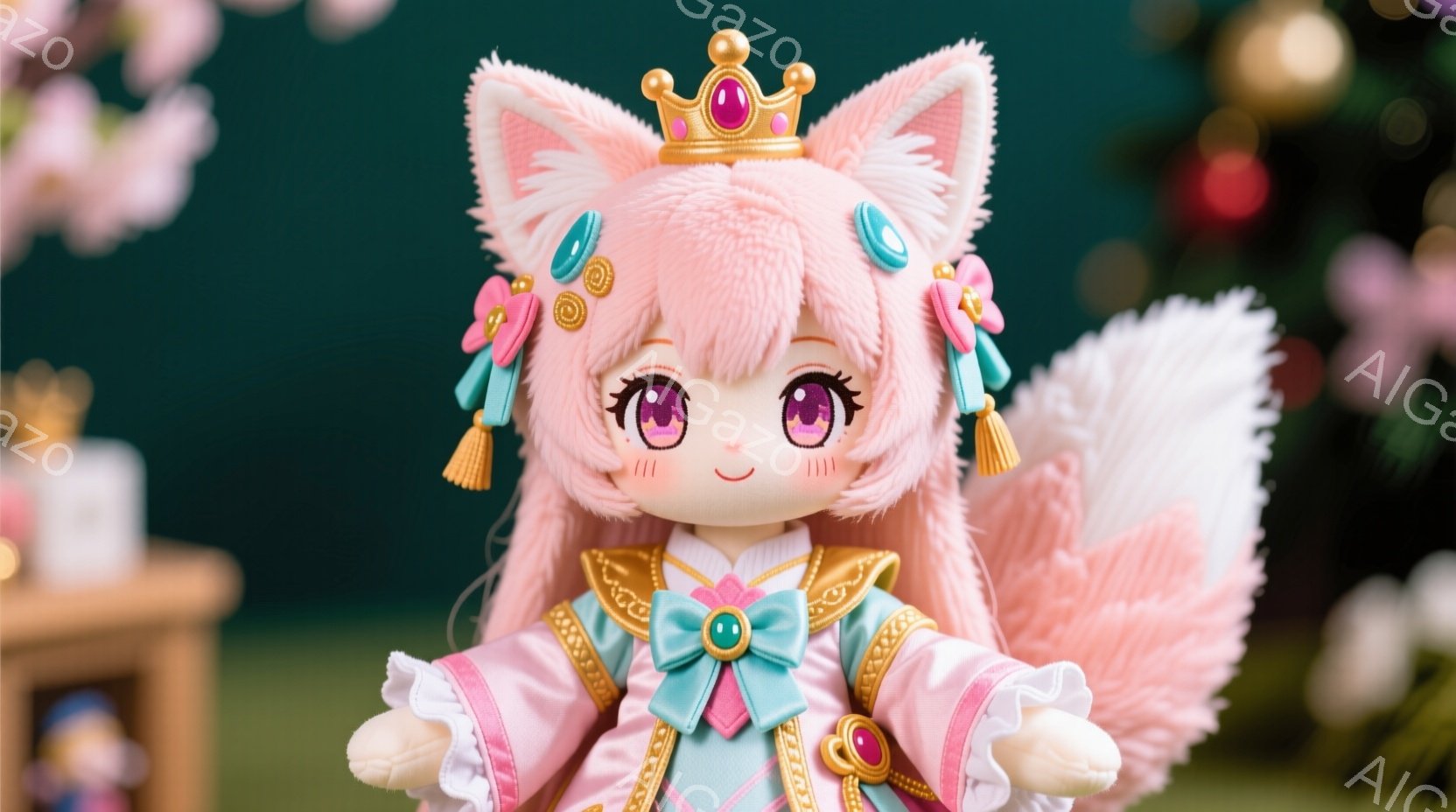 明るいピンク色の長い髪と、フォックスのような耳を持つ愛らしい人形が写っている。彼女は、淡いピンクと水色の組み合わせが美しい豪華なドレスを着ており、首元にはリボンがあしらわれている。背景にはぼやけた緑色の植物と、小さな白い建物が見え、ファンタジーのような穏やかな雰囲気を醸し出している。