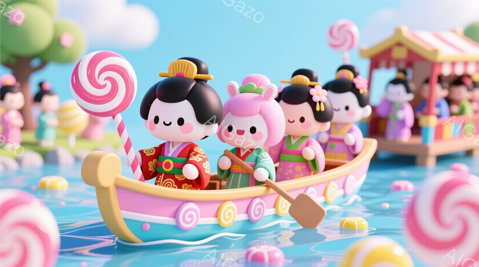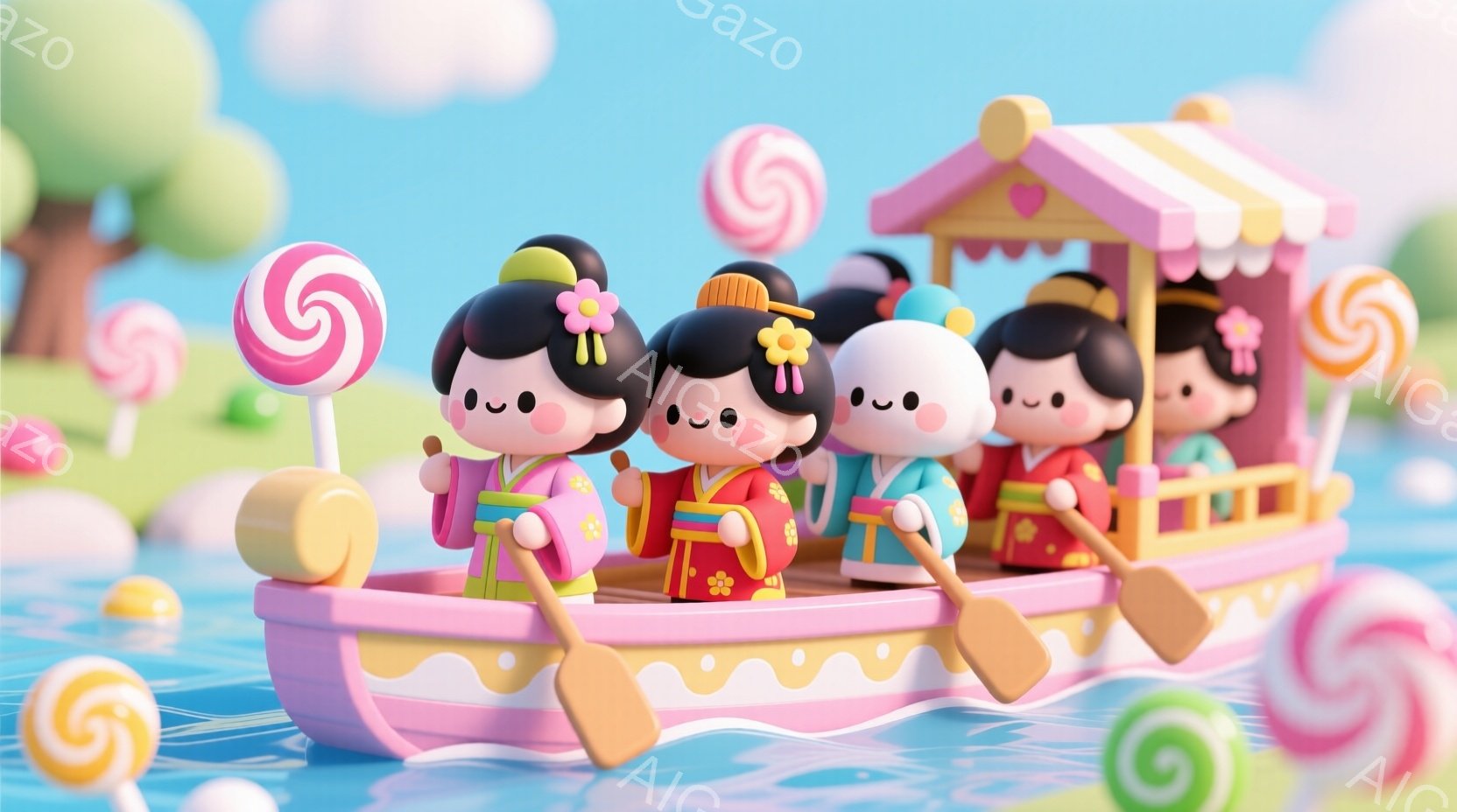 明るいピンク色の小舟に、着物を着た可愛らしいキャラクターたちが乗っています。キャラクターたちはそれぞれ異なる髪型と表情をしており、楽しそうな雰囲気です。背景には、キャンディや桜の木、そして水面に浮かぶカラフルな球体があり、夢のようなファンタジー世界を表現しています。