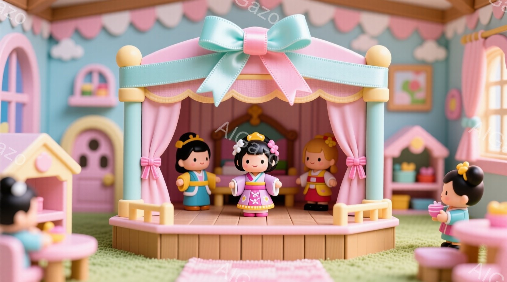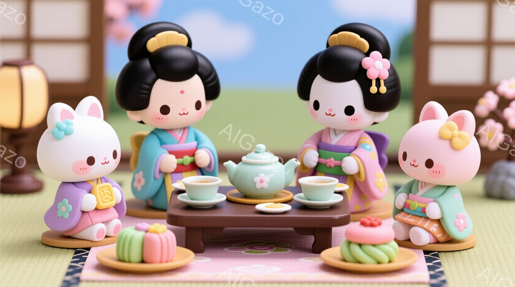 可愛らしい人形たちが、日本の伝統的な衣装である着物を身につけています。茶色の髪を三つ編みにし、頭には花飾りを付けています。彼らは低いテーブルを囲んで座り、お茶と和菓子を楽しんでいるようで、温かく穏やかな雰囲気が漂っています。