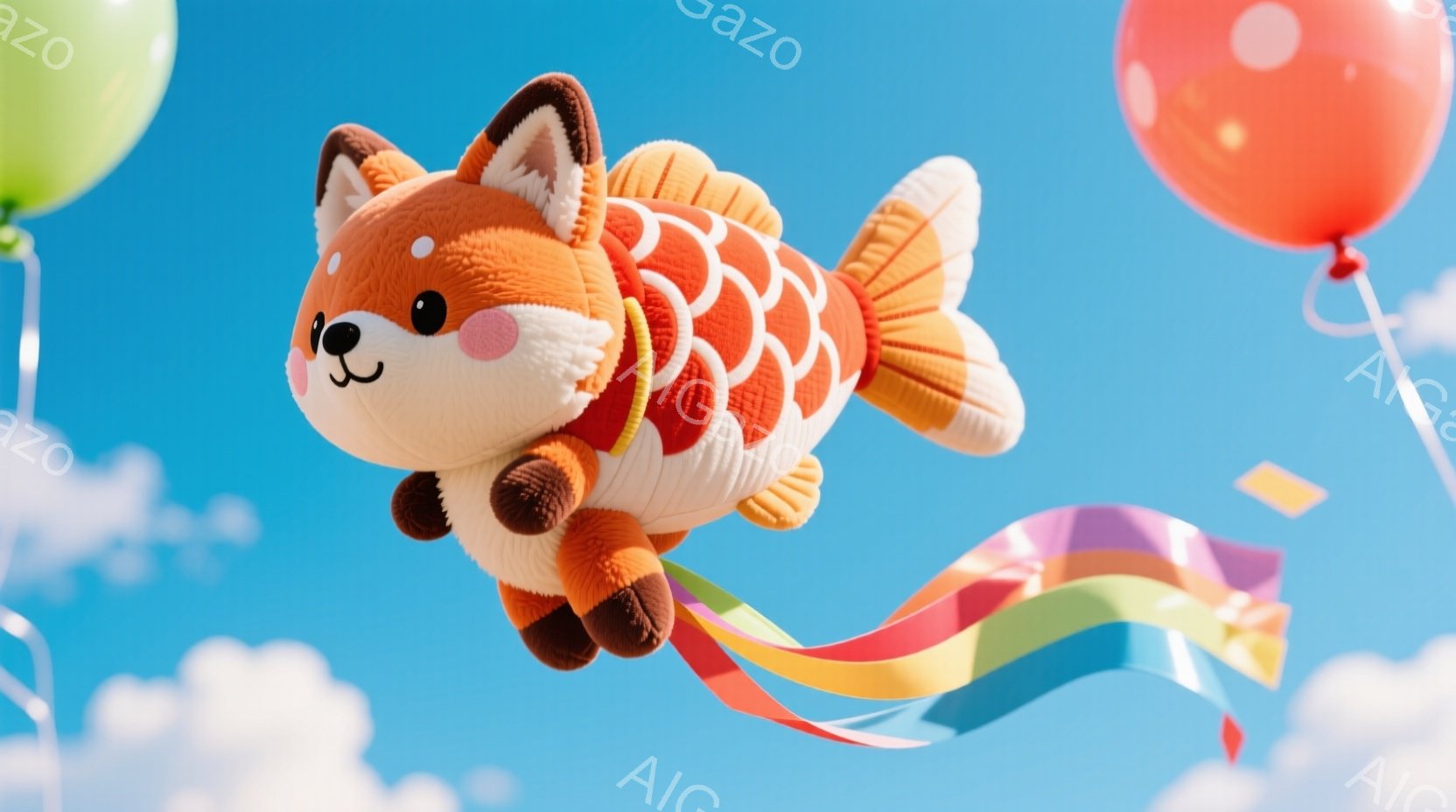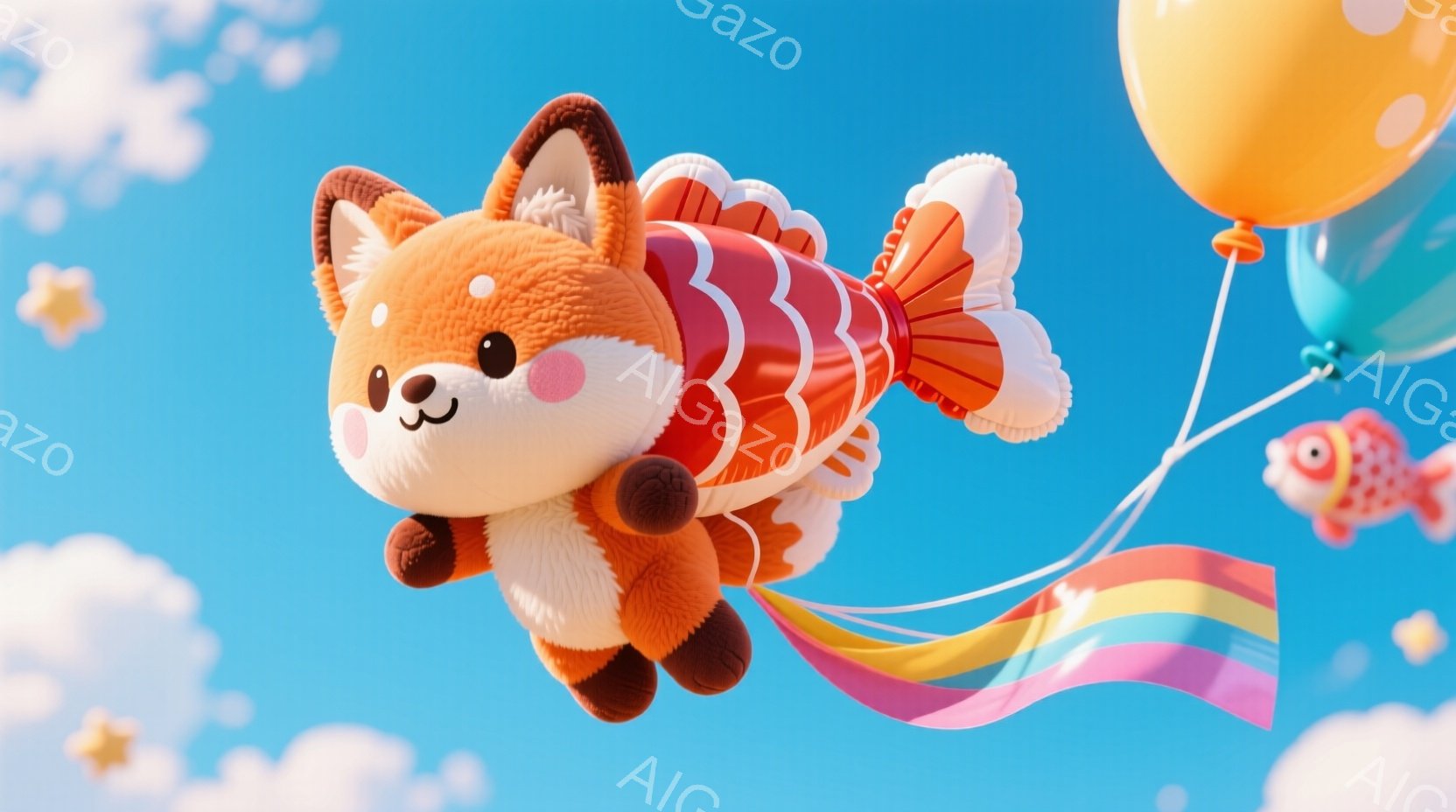 空には、可愛らしい鯉の形をしたふわふわのぬいぐるみと、ピンクと水色の風船が浮かんでいます。鯉のぬいぐるみはオレンジ色と白の模様で、愛らしい表情をしています。背景は澄み切った青空と白い雲で、全体的に暖かく、遊び心のある雰囲気です。