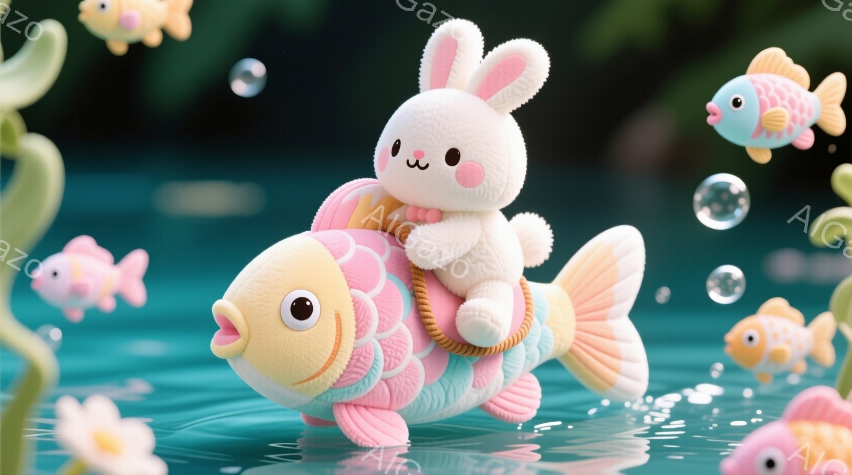 ふわふわのピンクとオレンジ色のkoi(コイ)の上に乗った白いウサギが描かれています。ウサギはピンク色の小さな靴を履き、嬉しそうな表情で前を見つめています。背景には水面、ピンク色の花、そして泡が浮かび、全体的に柔らかく、夢のような雰囲気が漂っています。