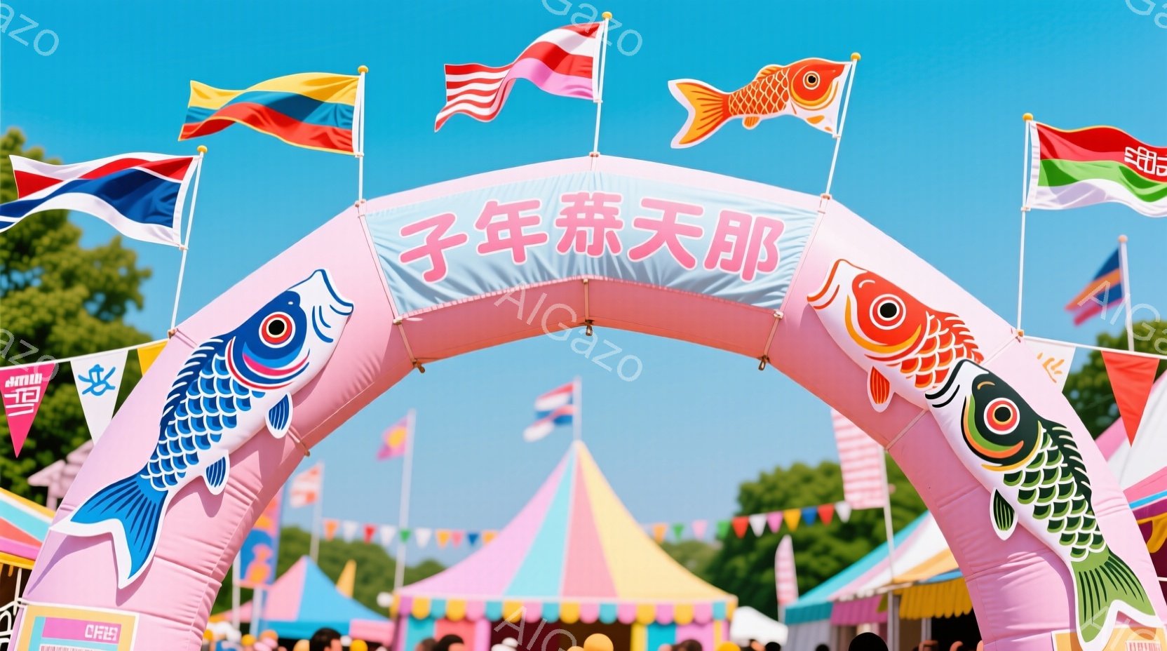 カラフルな鯉のぼりが並んだアーチが中央にあり、その下には人々が楽しそうに歩いている様子が描かれています。人々はカジュアルな服装で、背景には緑豊かな木々と青空が広がり、暖かい夏の日のイベントの雰囲気が漂っています。アーチの明るい色彩と人々の笑顔が、お祭りやイベントの活気と楽しさを強調しています。
