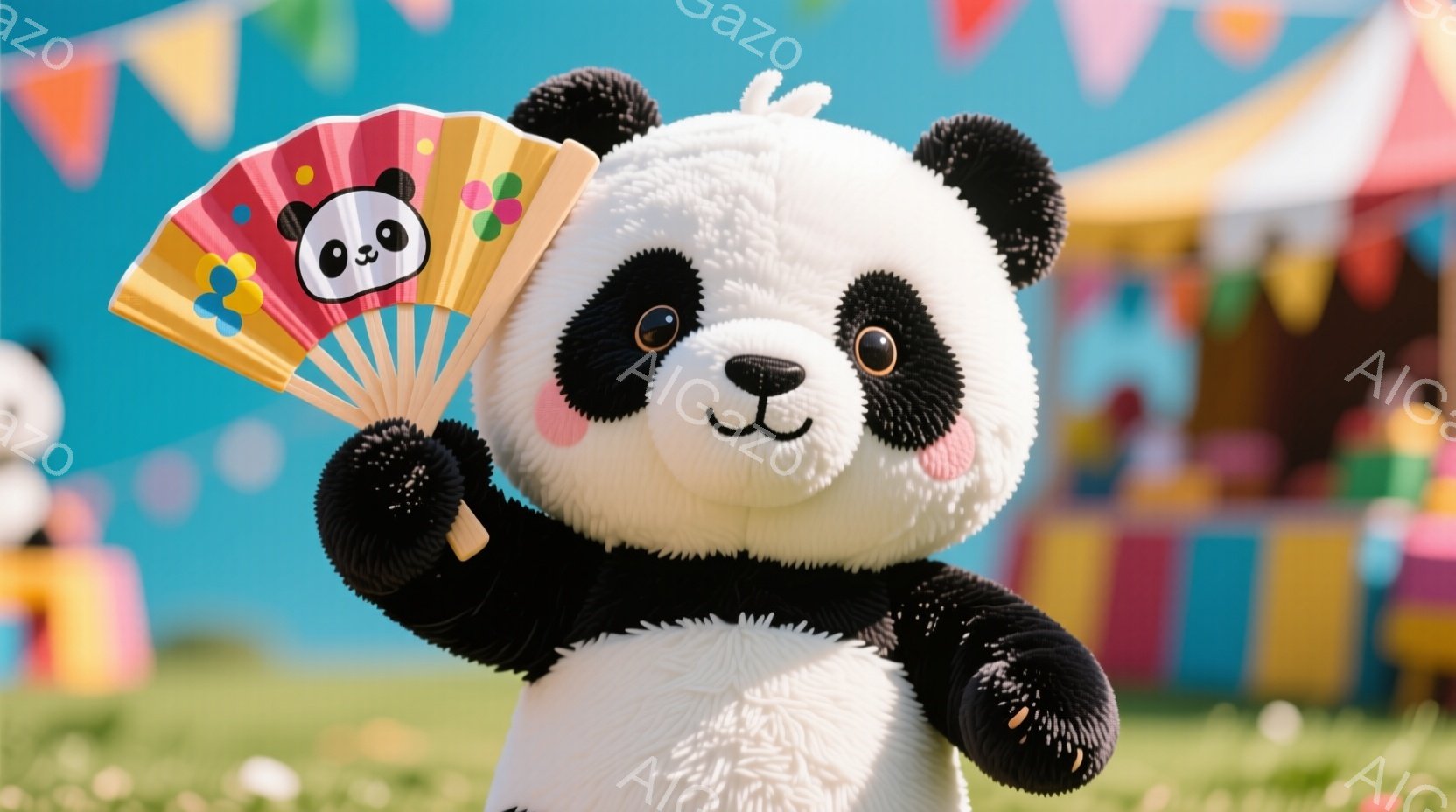 白と黒のふわふわとしたパンダのキャラクターが、カラフルな扇子を片手に持ち、微笑んでいます。首には、三角形の旗が連なったガーランドが飾られており、背景には緑の芝生と、ぼやけたカラフルな建物や人々が見えます。全体的に明るく、楽しいお祭りのような雰囲気が漂っています。