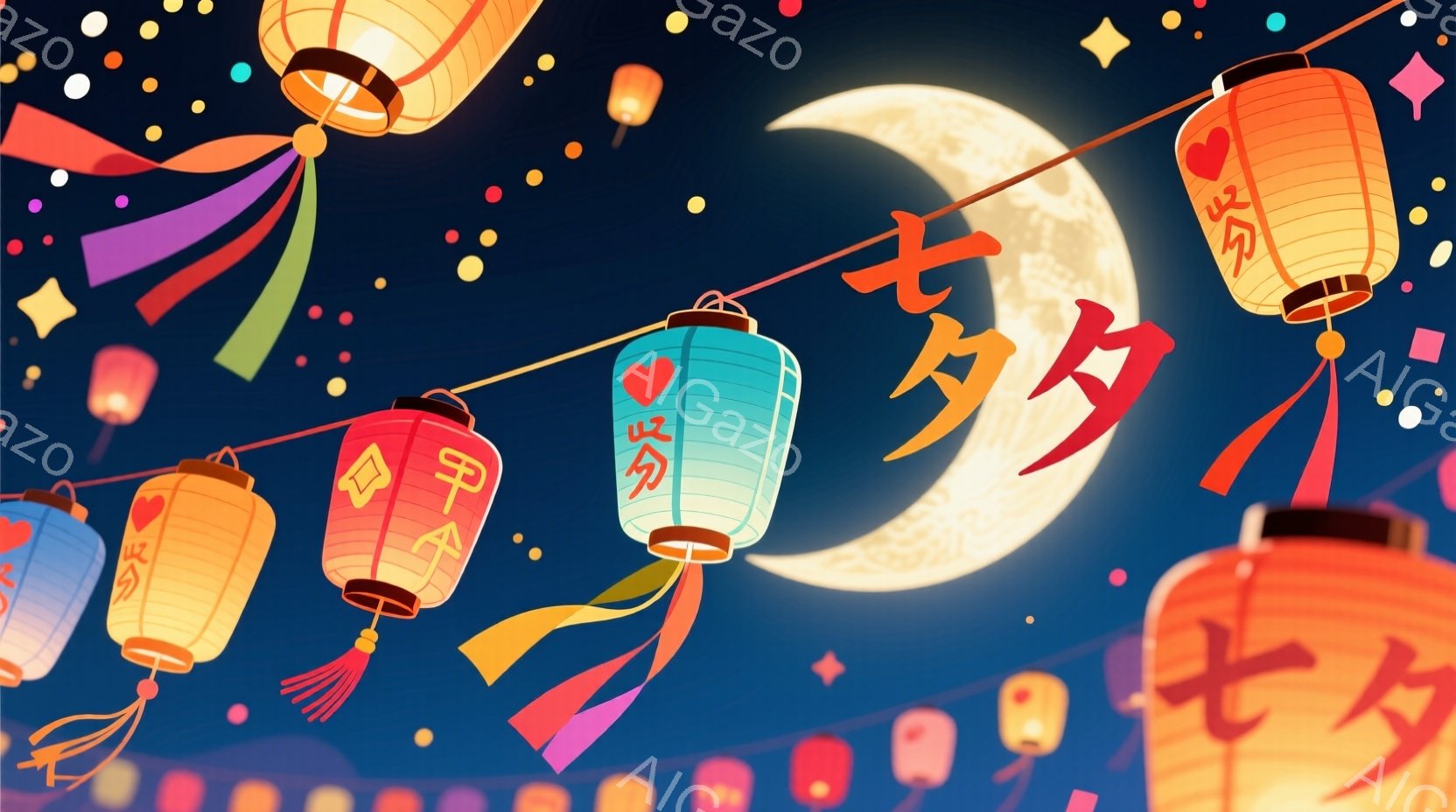 この無料AI生成画像「深い青色の夜空に、色とりどりの提灯と風車が飾られています。提灯には様々な絵柄が描かれており、温かい光を放っています。背景には暗い木々が見え、全体的に幻想的で、お祭りの賑やかな雰囲気を伝えています。」は、2025年10月23日に作成されました。 サイズは 1664×928px の高解像度で、商用利用も可能なフリー素材として提供しています。
