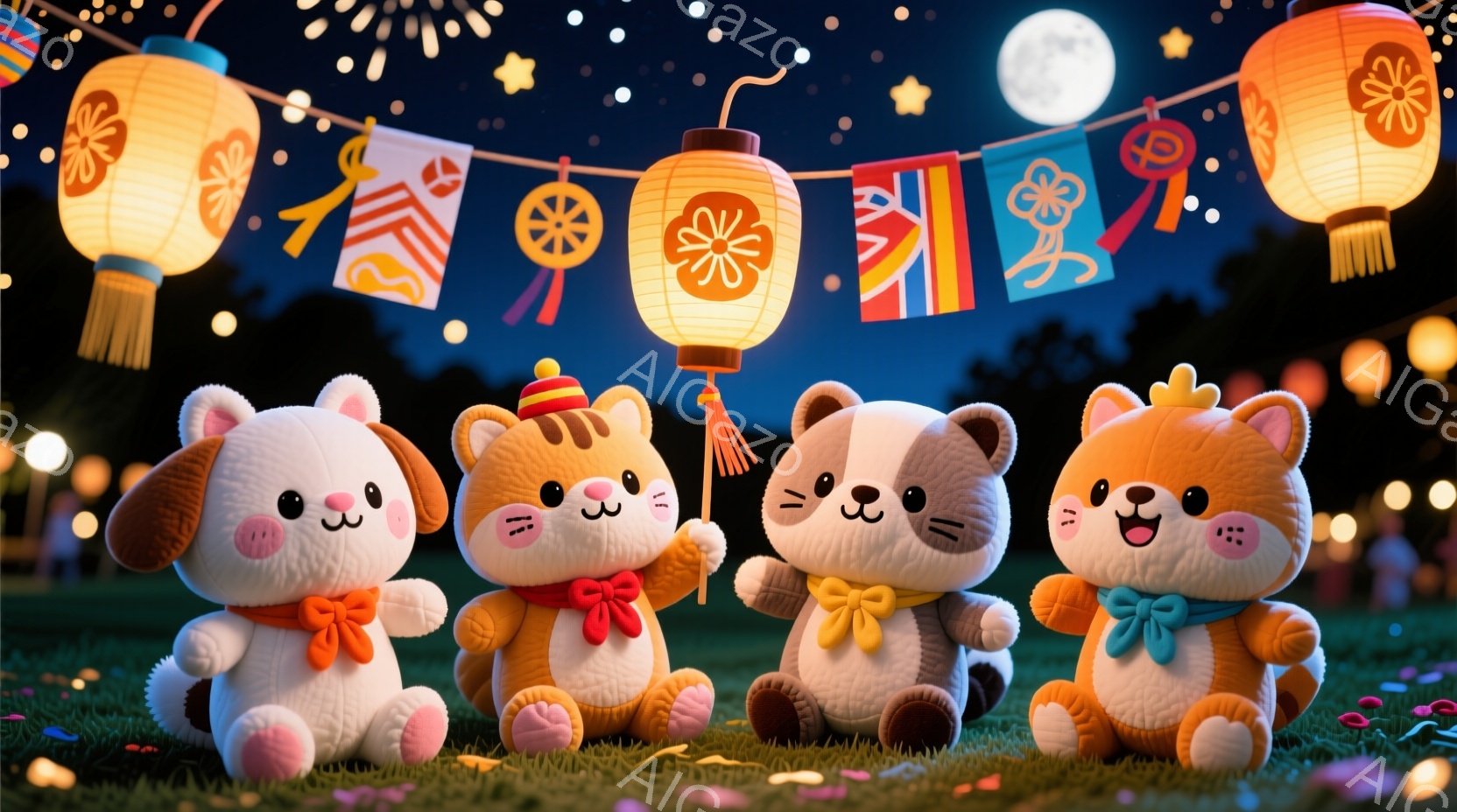 明るい青色の背景に、ふわふわとした動物のキャラクターたちが並んでいます。各キャラクターはそれぞれ異なる色の服を着ており、楽しそうな表情をしています。背景には提灯や月が輝き、夜祭りのような温かく幻想的な雰囲気を醸し出しています。