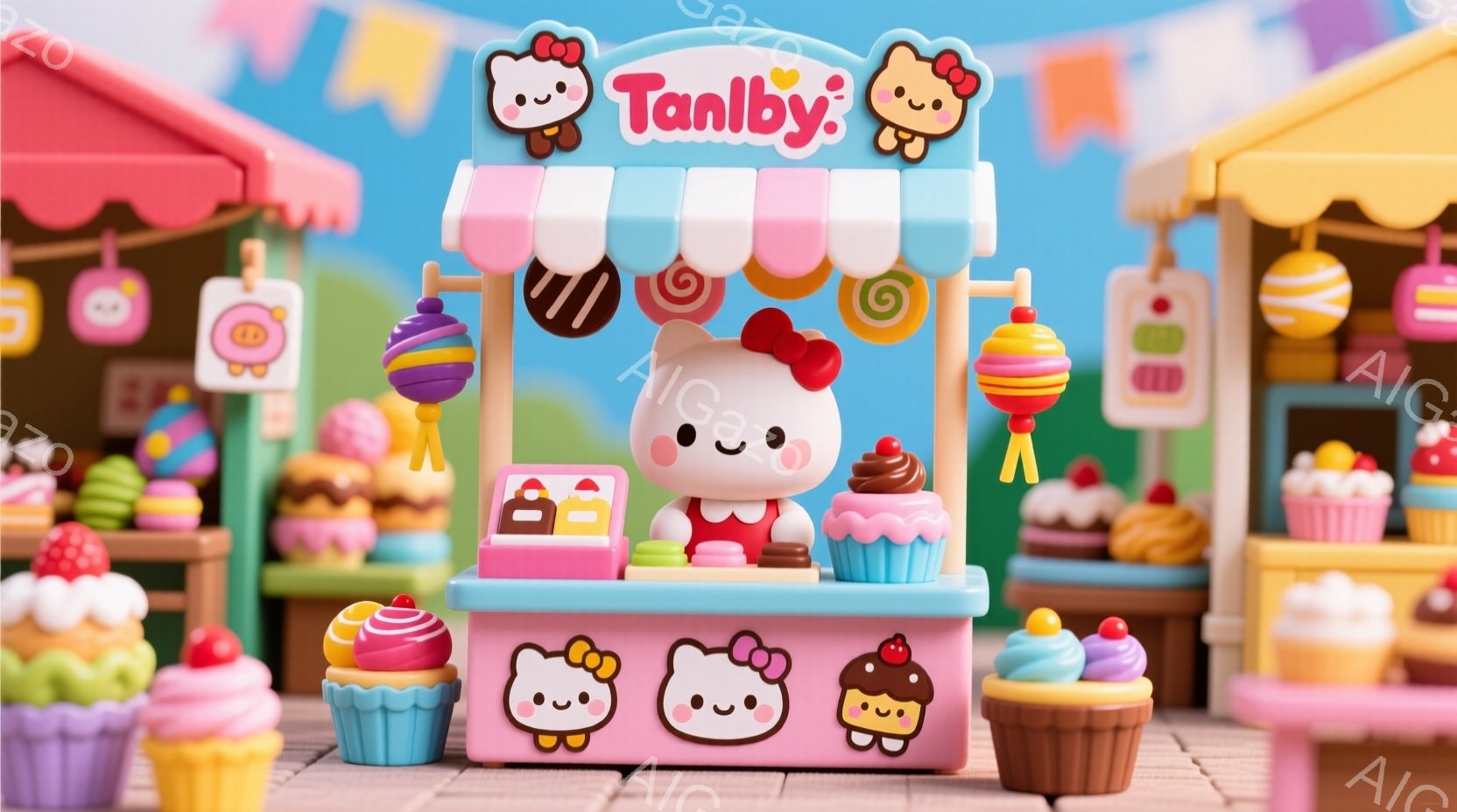 鮮やかな緑の芝生の上に、可愛らしいお菓子屋さんのセットが置かれています。青い屋台には、ピンク色のリボンで飾られた白い可愛らしいキャラクターが立っており、笑顔で様々なお菓子を並べています。背景には、色とりどりのキャンディーやソフトクリームが置かれた鉢植え、そしてピンクと白の可愛らしい建物が見え、全体的に夢のような雰囲気を醸し出しています。
