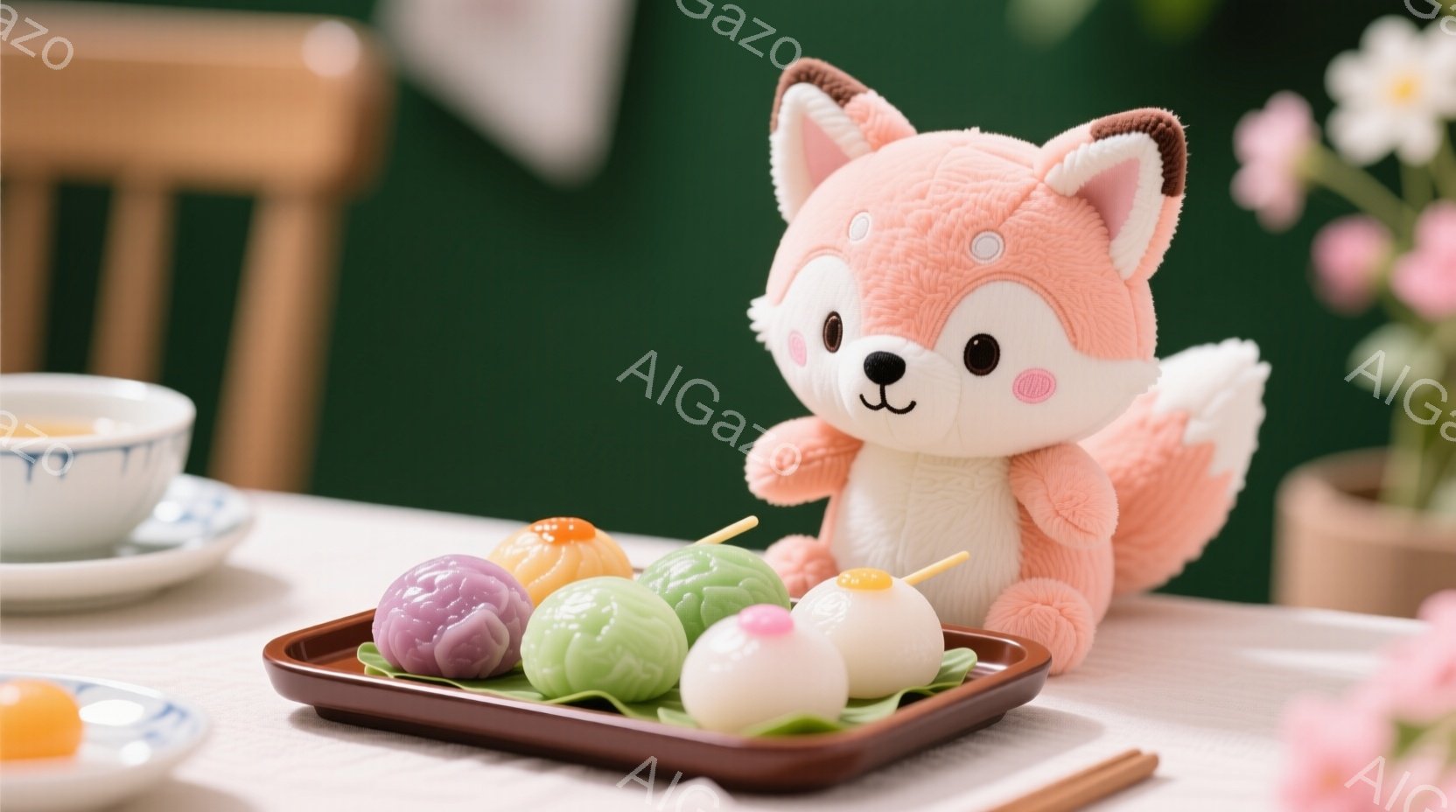 この無料AI生成画像「薄桃色のふわふわとした子ギツネのぬいぐるみと、白皿に並べられた団子が写っている。団子はピンク、白、緑、茶色の四色で、皿は赤い縁取りのある白い四角い皿である。背景には木製の棚と茶色のカップが見え、全体的に穏やかで優しい雰囲気である。」は、2025年10月23日に作成されました。 サイズは 1664×928px の高解像度で、商用利用も可能なフリー素材として提供しています。