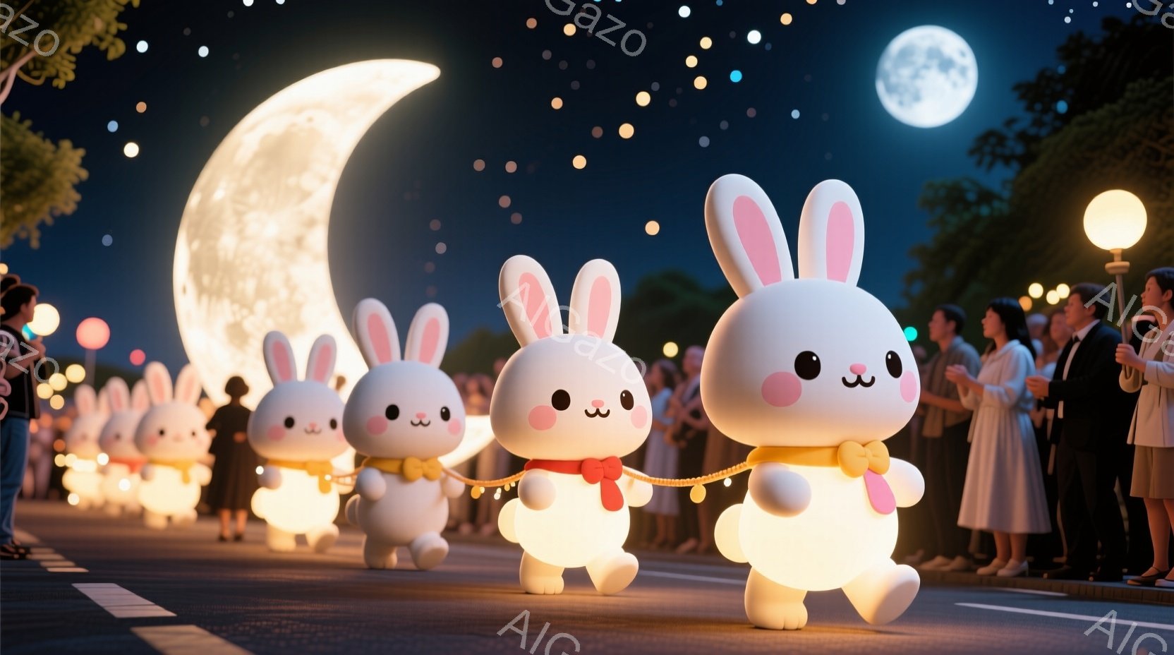 夜の街を、可愛らしいウサギのパレードが進行している様子が描かれています。ウサギたちはそれぞれ小さな光を放つ星の飾りを身につけ、満月型のフロートに乗って行進しており、楽しそうな表情をしています。背景には夜空と街の明かり、そして観客の姿が見え、幻想的で温かい雰囲気が漂っています。