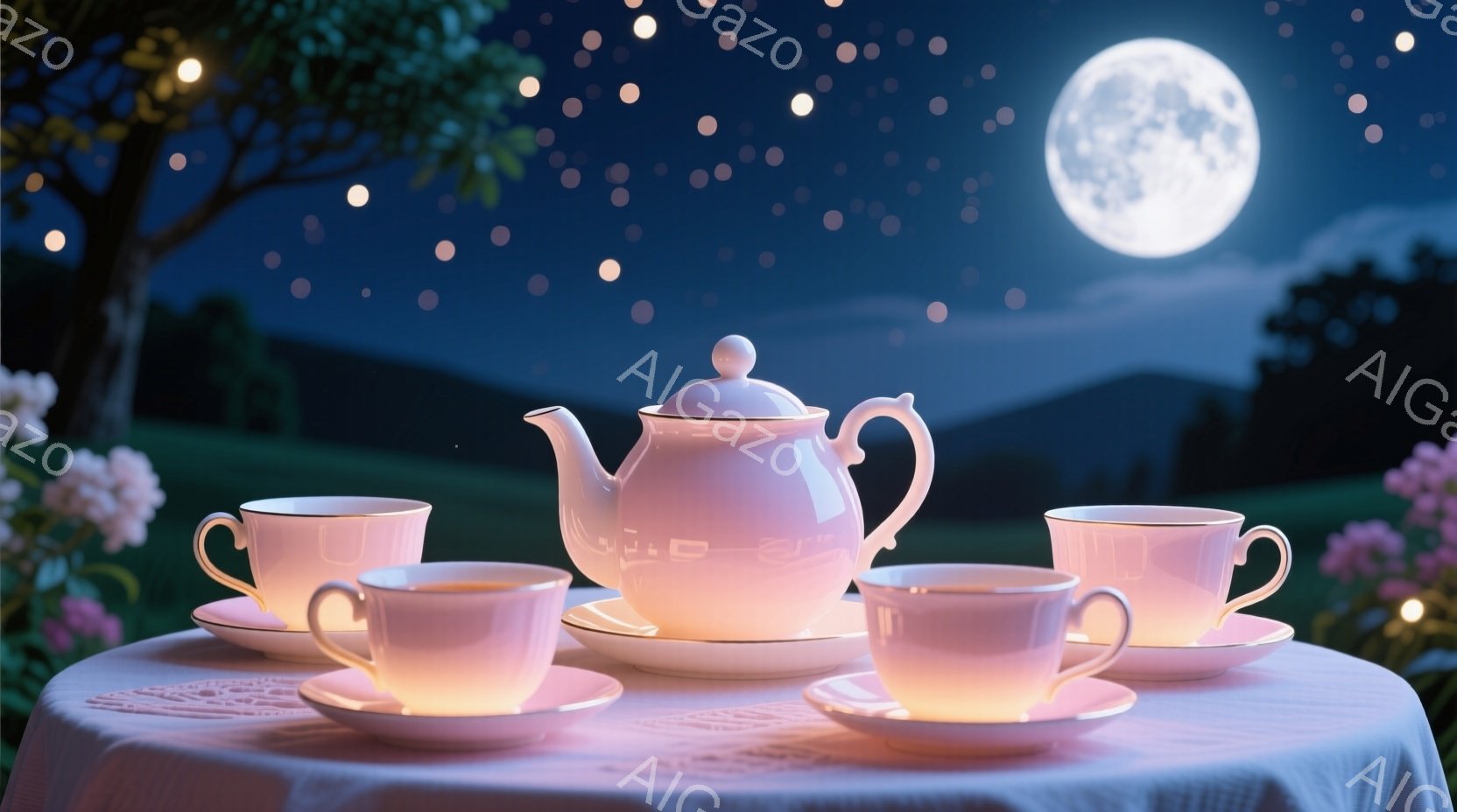 夜の庭に、淡いピンク色のティーセットが並べられている。満月が輝き、周囲にはぼんやりとした光の玉が浮かび、幻想的な雰囲気を醸し出している。テーブルクロスは明るいピンク色で、穏やかで優雅な夜のティータイムを連想させる。