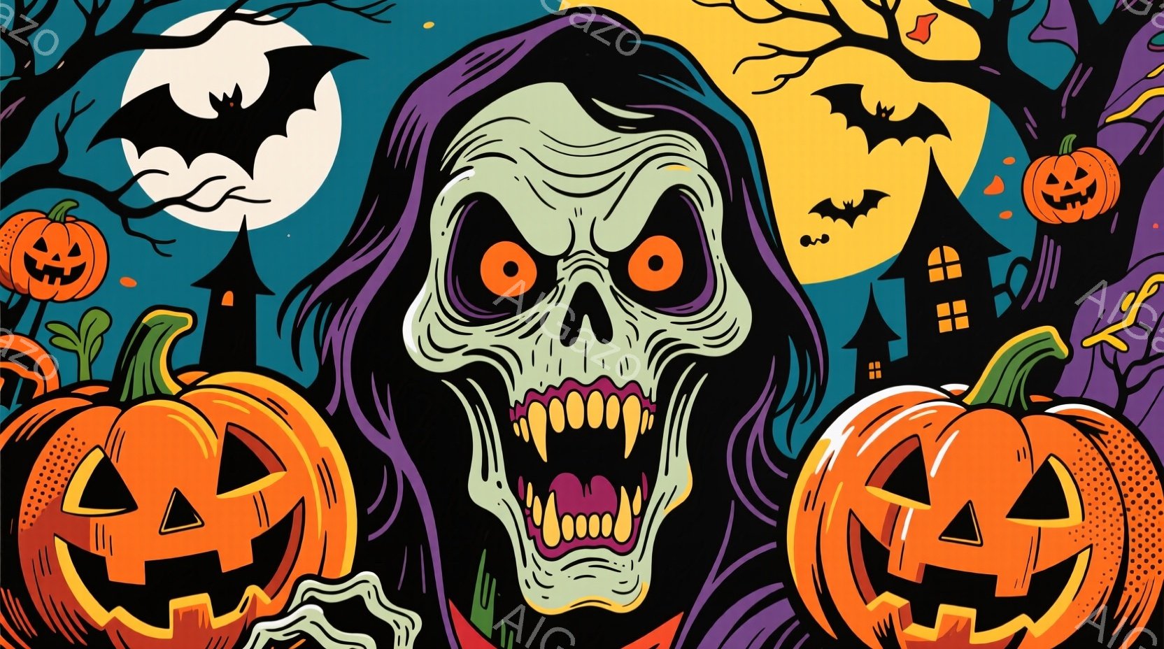 不気味なスケルトンの顔が中央に大きく描かれており、紫色のフードで覆われている。背景には、ハロウィーンの建物、ジャック・オ・ランタン、夜空に舞うコウモリが見られ、全体的に不気味でハロウィーンらしい雰囲気を醸し出している。オレンジと紫の鮮やかな色彩が、一層この不気味さを強調している。