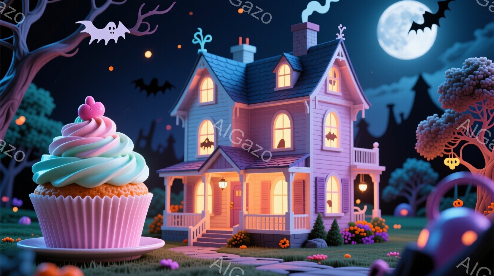 鮮やかなピンク色の可愛らしい家が、満月の夜に浮かび上がっています。家の周りには、大きなカップケーキの形をした幽霊や、ハロウィーンらしいカボチャ、フェンス、そして緑豊かな植物が配置され、夢のような雰囲気を醸し出しています。全体的にパステルカラーで統一されており、暖かく、遊び心にあふれたハロウィーンの情景が表現されています。