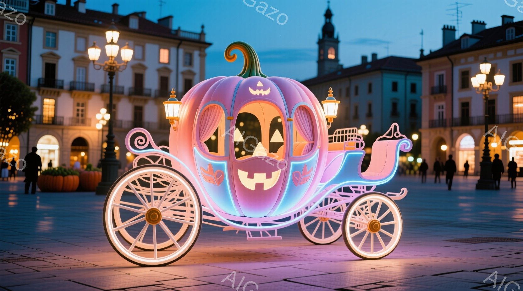 広場に置かれたカボチャの形をした馬車が印象的です。馬車はオレンジとピンクの色合いで、ハロウィーンの雰囲気を醸し出しています。背景には石畳の道、華やかな建物、そして夕暮れ時の穏やかな空が広がっており、幻想的な雰囲気を演出しています。
