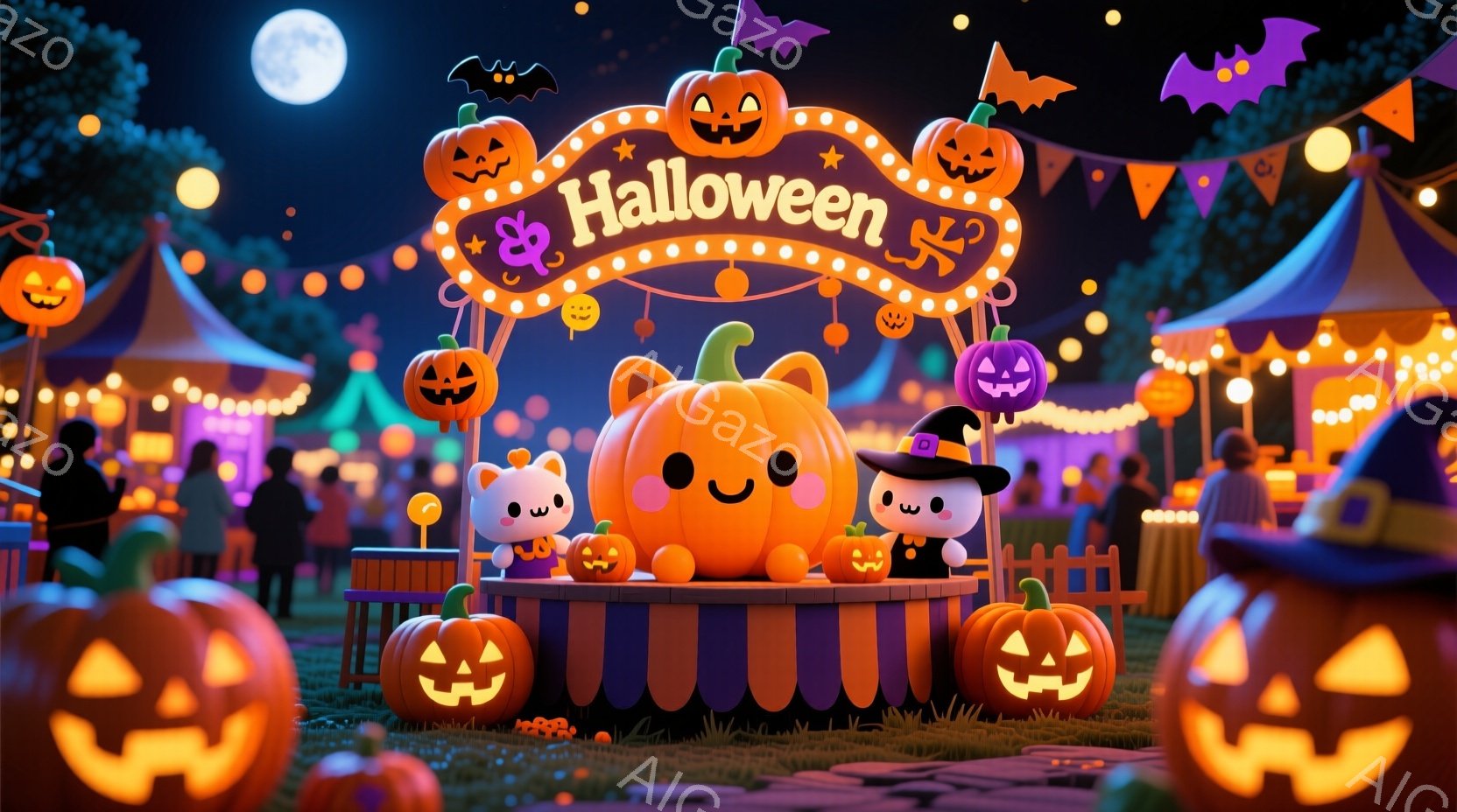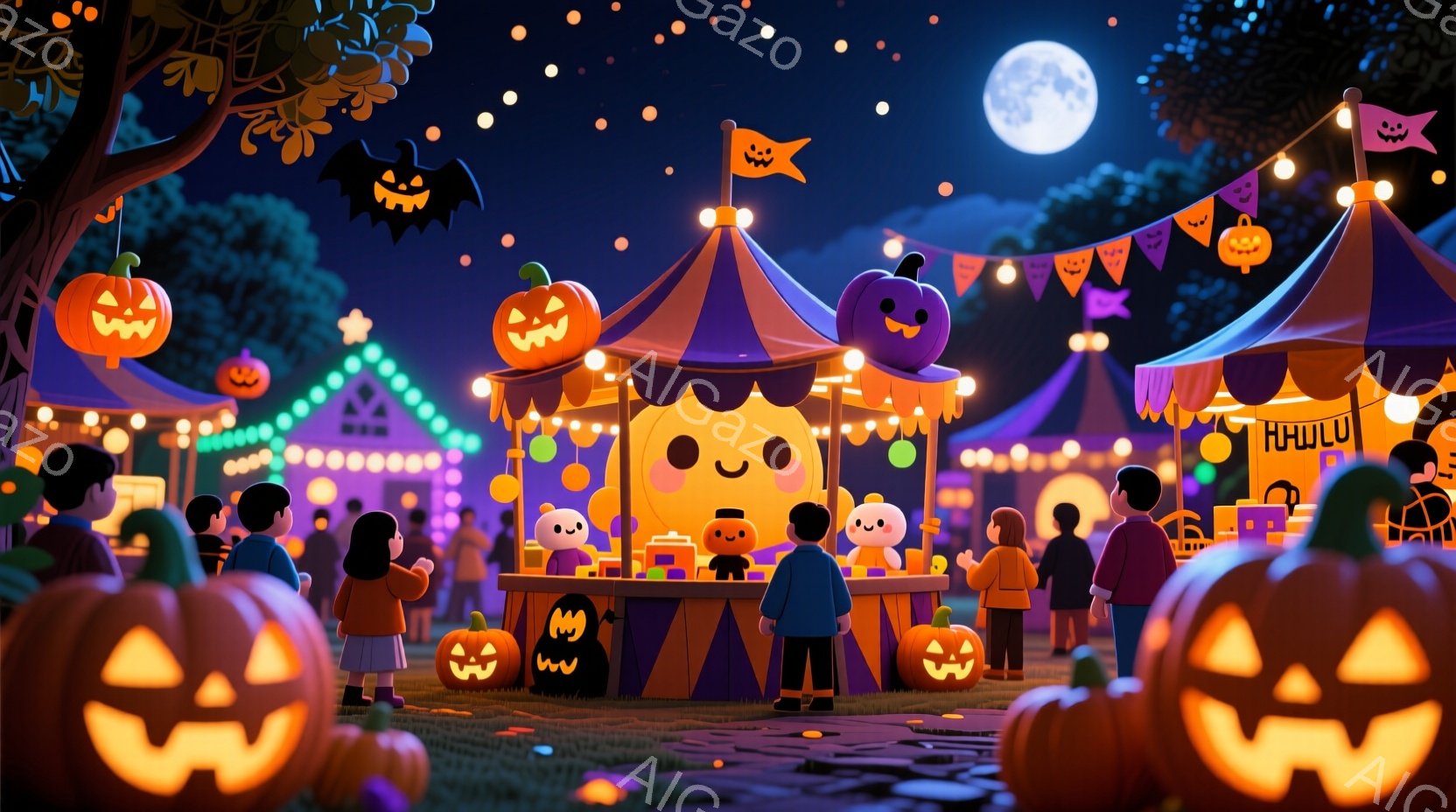 広場ではハロウィーンの夜祭が開かれており、様々な大きさのジャック・オ・ランタンが至る所に飾られています。中央には魔女帽子をかぶった大きなジャック・オ・ランタンがテーブルの上で微笑んでおり、背景にはカラフルな屋台と人々が楽しげに歩き回る姿が見えます。夜空には満月が輝き、暖かいオレンジ色の光とハロウィーンらしい飾り付けが、お祭り全体の楽しい雰囲気を高めています。