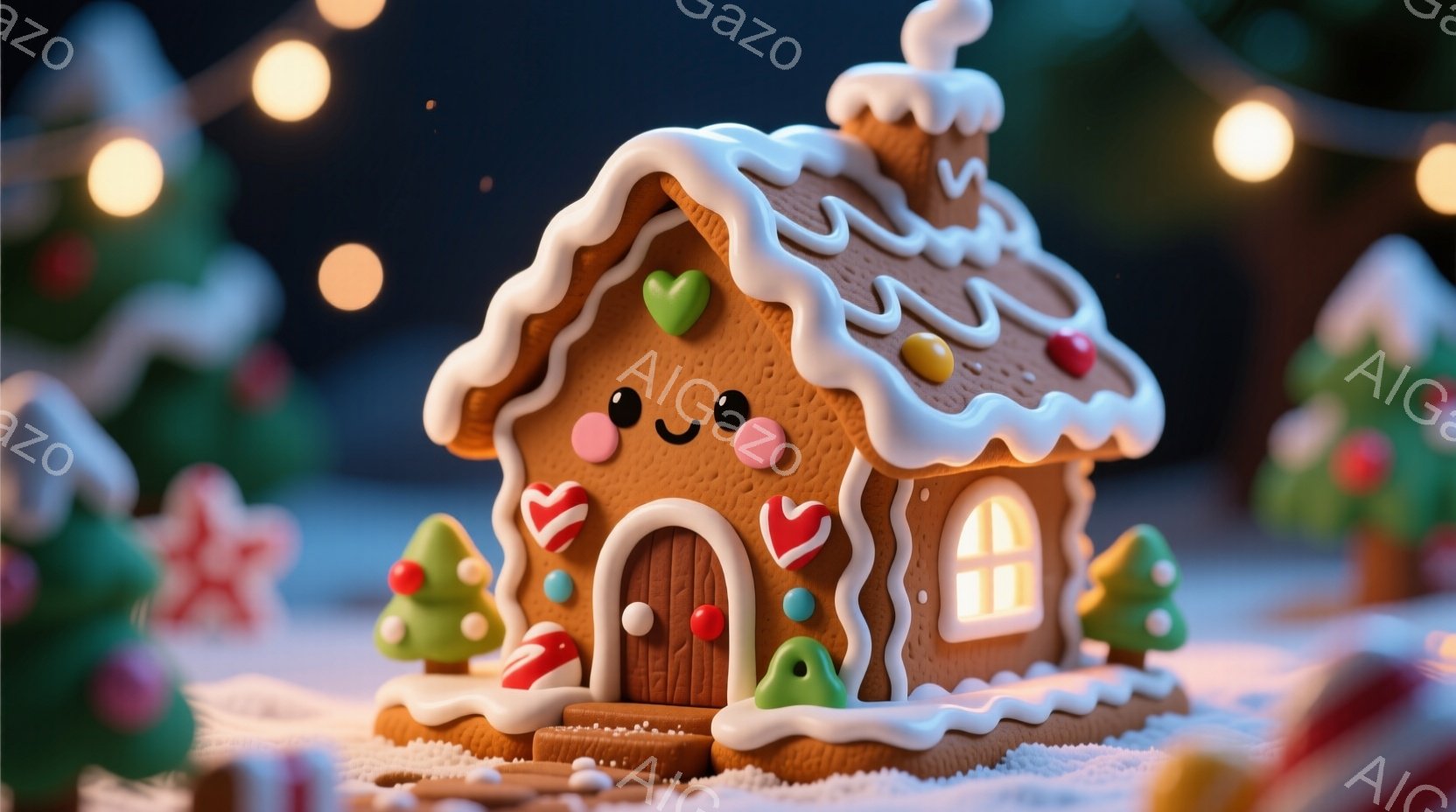 可愛らしいジンジャーブレッドハウスが雪の上に建っています。屋根には白いアイシングが波打つように飾り付けられ、カラフルなキャンディーやクッキーが貼り付けられています。背景には、ぼんやりとした緑色のクリスマスツリーと暖色の光が点在し、お祝いの雰囲気を醸し出しています。