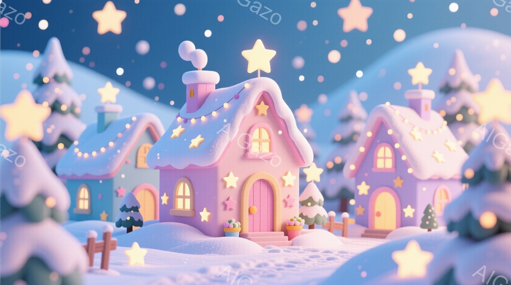 暖かく優しい色合いの雪景色が描かれています。ピンクや水色の可愛らしい家々が雪に覆われ、星やハートの装飾が施されています。背景には雪の積もった丘と、星が散りばめられた空が広がり、ファンタジックで夢のような雰囲気を醸し出しています。