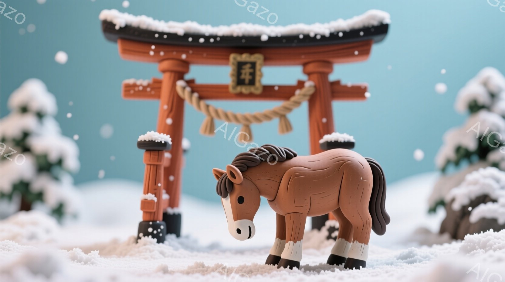 雪景色の中に、茶色い馬が一頭立っています。背景には赤い鳥居があり、雪で覆われた木々が風景を彩っています。全体的に、静かで穏やかな冬の雰囲気が漂っています。