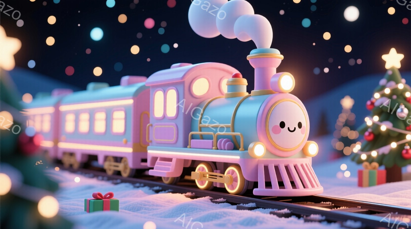 白い雪景色の中に、可愛らしいピンクと水色の蒸気機関車が描かれています。機関車の窓は暖かく光っており、雪の上に置かれたプレゼントボックスと背景のクリスマスツリーが祝祭の雰囲気を醸し出しています。全体的に、温かく、夢のような、お祝いの雰囲気が漂う、クリスマスの情景です。