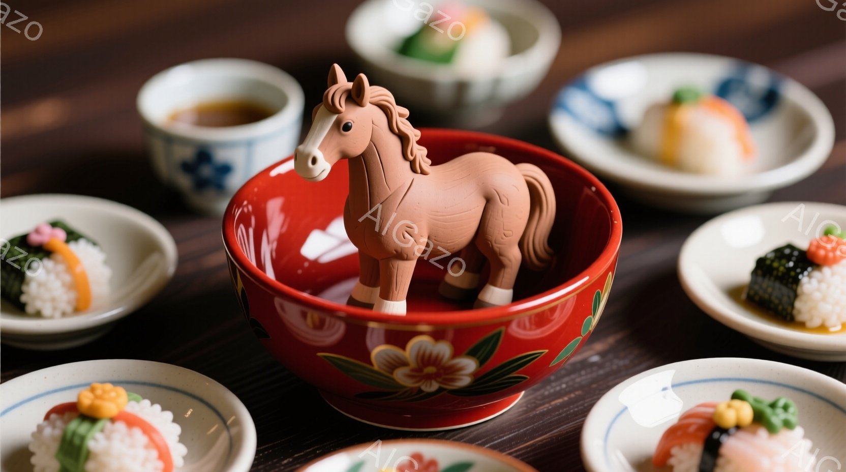 深紅色の器の中に、可愛らしい茶色の馬の置物が立っている。器の周りには、様々な具材を乗せた小さなおにぎりが並べられており、奥には湯呑みが置かれている。全体的に落ち着いた色調で、日本の伝統的な雰囲気が漂う、温かい食卓の風景である。