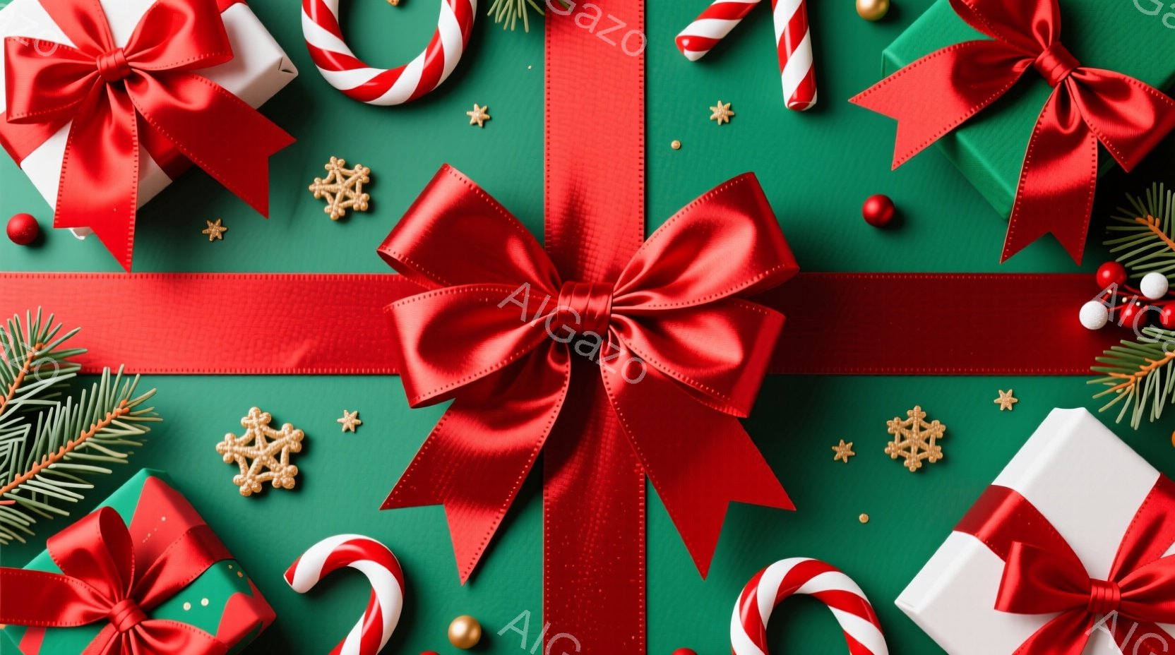 深緑色の背景に、様々なクリスマス装飾が散りばめられています。赤いリボンが中央に大きく結ばれ、その下に赤いギフトボックス、左には緑色のギフトボックスが置かれています。キラキラと輝く雪の上に置かれたこれらのプレゼントは、暖かく華やかなクリスマスの雰囲気を醸し出しています。