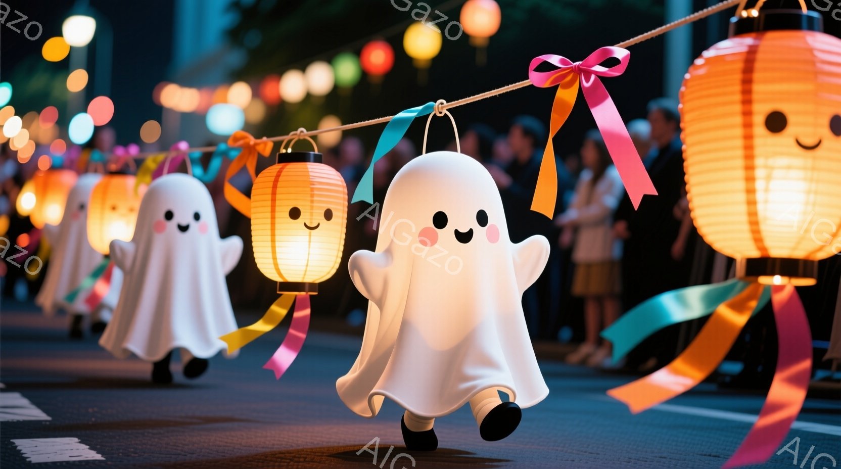 白い幽霊のような姿をしたキャラクターが、提灯を手にしながら道路を歩いている。それぞれのキャラクターは、オレンジ、ピンク、緑、黄色と異なる色のリボンで装飾されており、愛らしい表情を浮かべている。背景にはぼやけた人々の姿が見え、提灯が並び、夜の祭りのような賑やかな雰囲気を醸し出している。