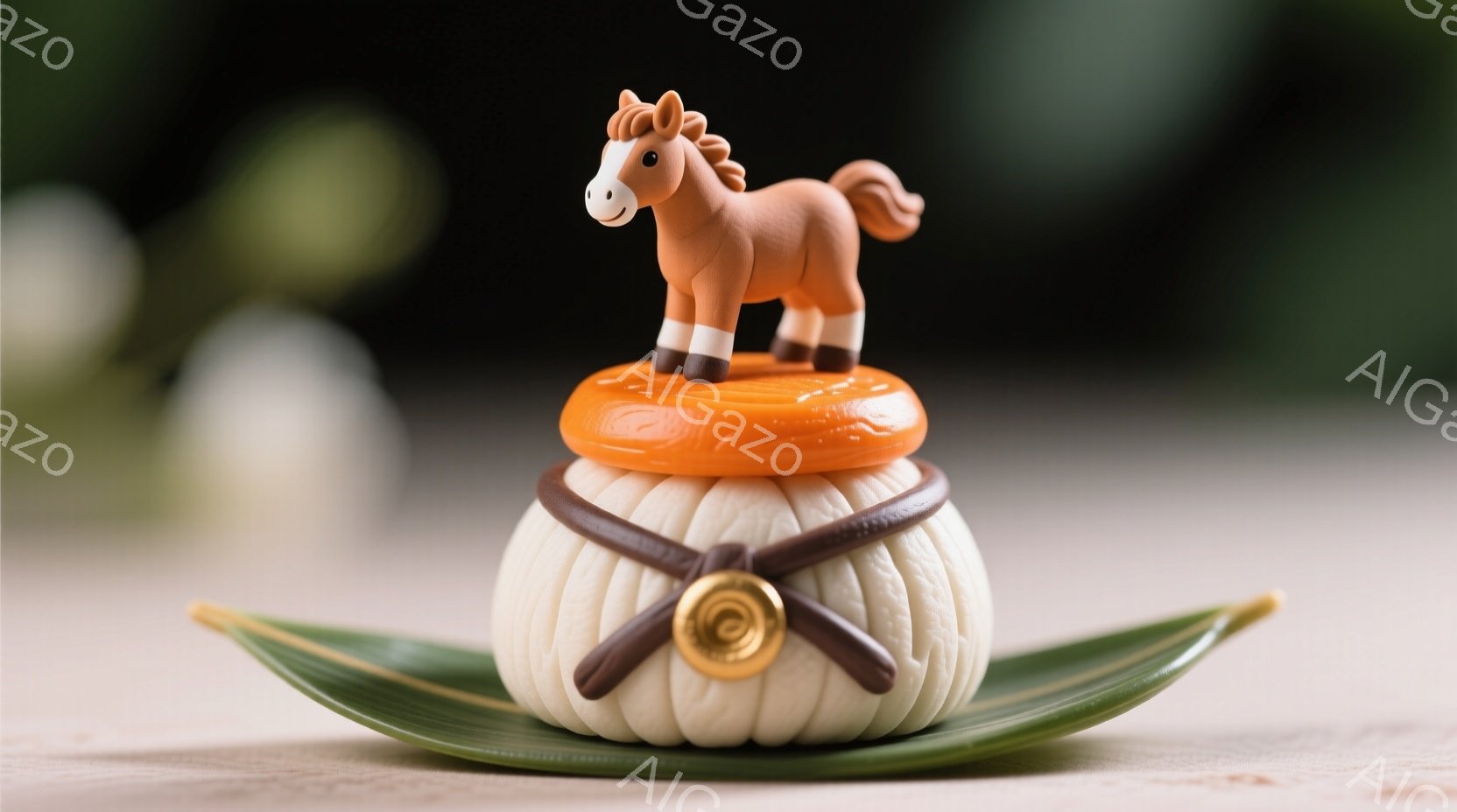 白い団子の上にオレンジ色の小さな馬の置物が乗っており、団子にはオレンジ色の「X」のマークが描かれています。緑色の葉の上に団子が置かれ、背景には竹編みのマットとぼやけた背景が見えます。全体的に、可愛らしく、お祭りや特別な機会を連想させる雰囲気です。