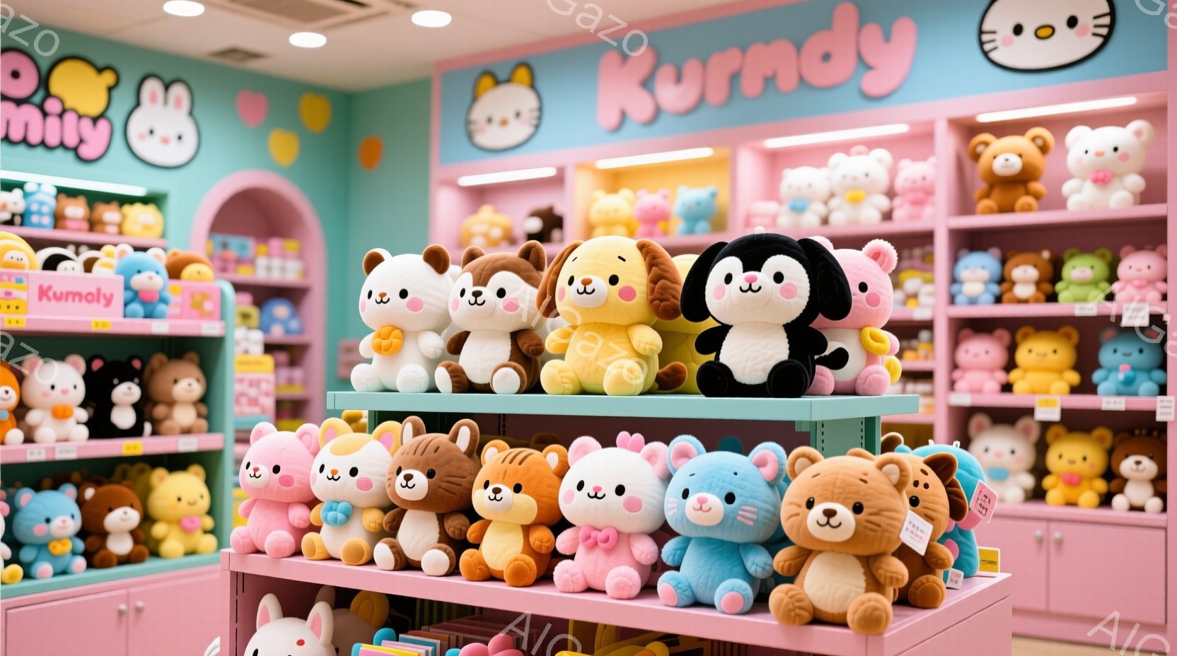 この無料AI生成画像「店内には、様々な色のふわふわした動物のぬいぐるみたちが棚に並んでいます。ピンク、茶色、水色、黒など、カラフルなぬいぐるみたちは皆、可愛らしい表情をしており、見ているだけで心が温まります。背景には、同じキャラクターがデザインされたピンク色の装飾があり、店内全体が明るく、楽しい雰囲気に包まれています。」は、2025年10月23日に作成されました。 サイズは 1664×928px の高解像度で、商用利用も可能なフリー素材として提供しています。