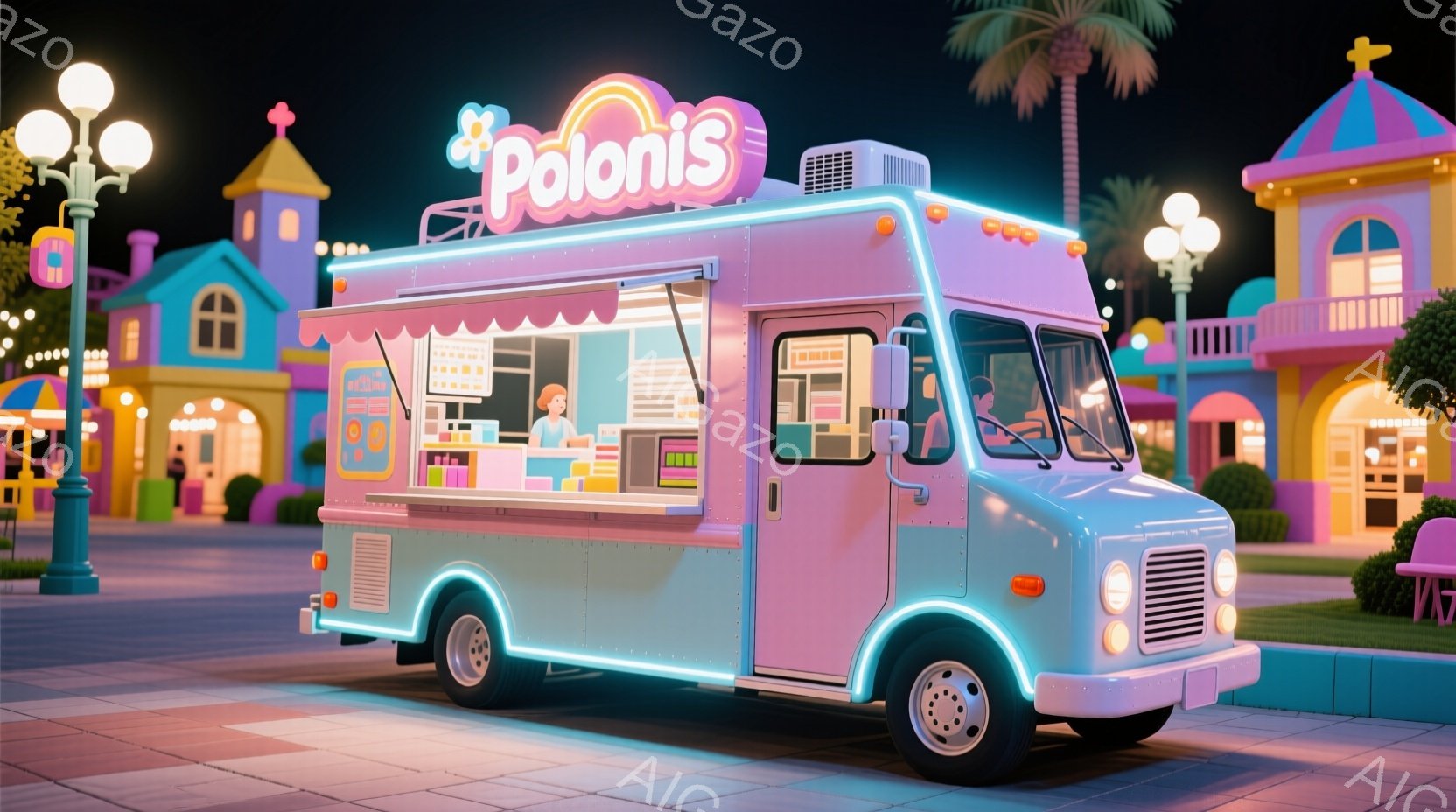 明るいパステルブルーのフードトラックが、夜の街並みに佇んでいます。トラックにはカラフルなドーナツやケーキが並び、可愛らしいキャラクターのロゴが描かれています。背景には、パステルカラーの建物や街灯が並び、温かく幻想的な雰囲気を醸し出しています。