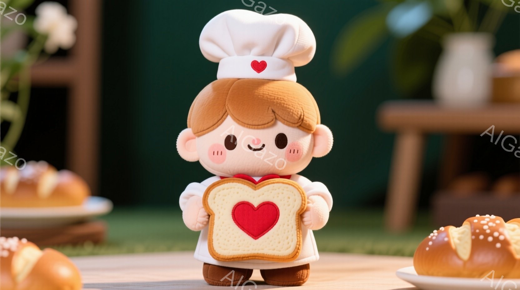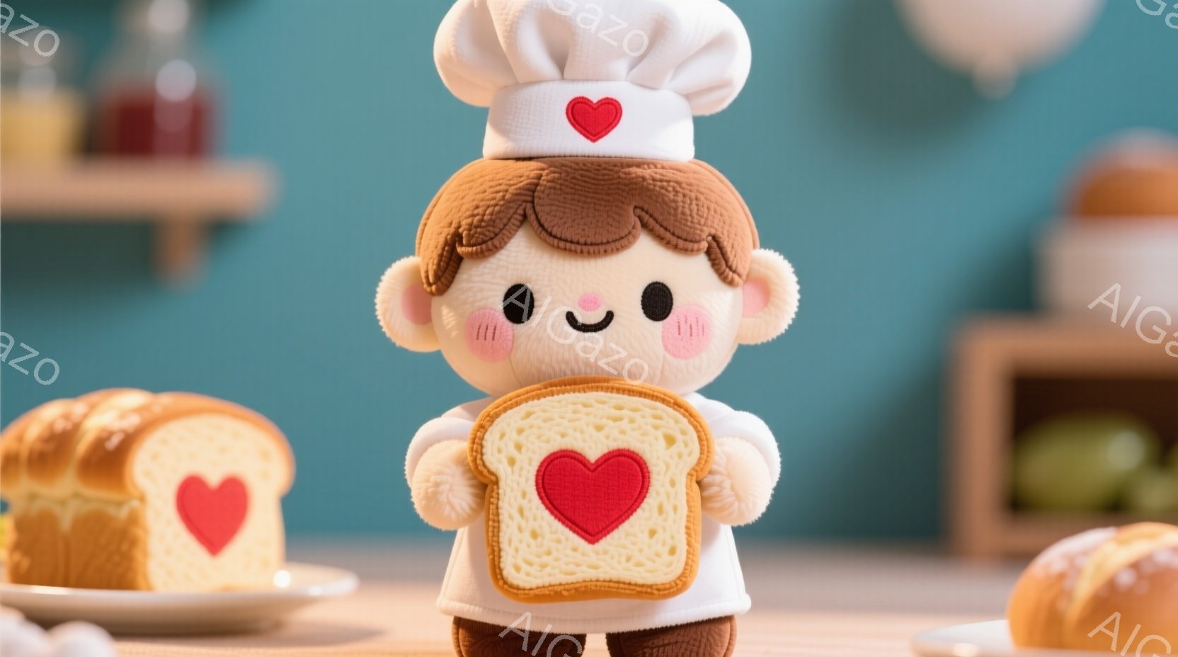 ふわふわの茶色い髪と赤い帽子をかぶった、愛らしいぬいぐるみが中央にいます。白いエプロンを着て、ハートが描かれたトーストを抱えています。背景には木製の棚とパンが置かれ、暖かく優しい雰囲気が漂っています。