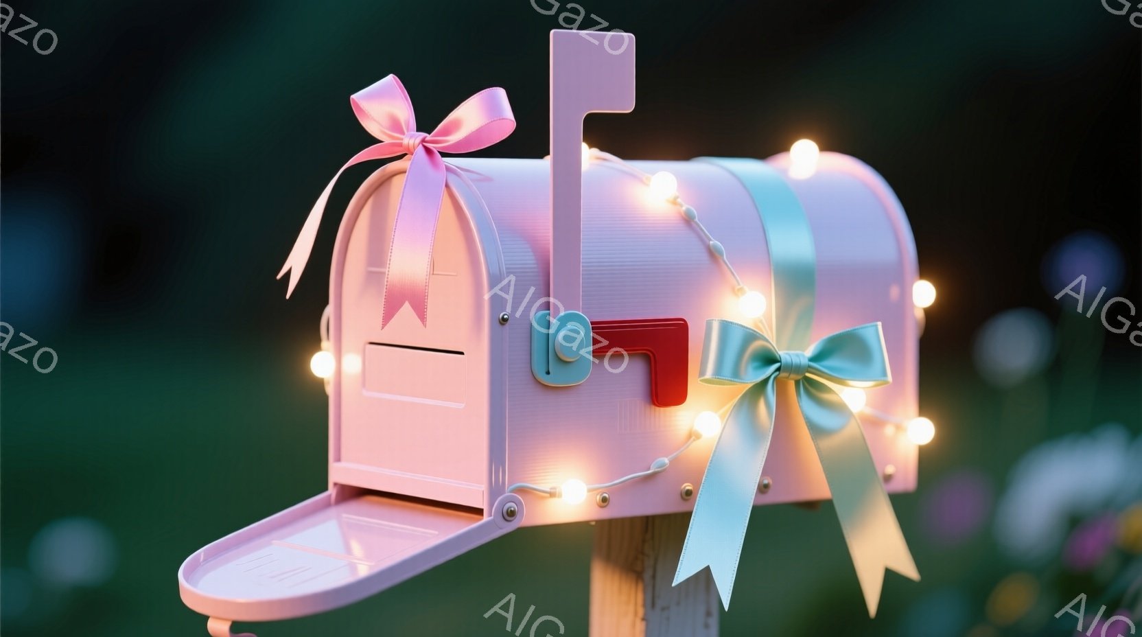 郵便受けが写っており、明るいピンクのリボンで飾られています。背景にはぼやけた緑の芝生と、鮮やかなピンクと黄色の花々が見え、光の玉が幻想的な雰囲気を醸し出しています。全体的に柔らかく、夢のような、ロマンチックな印象を与えます。