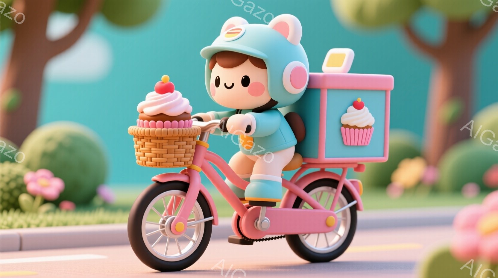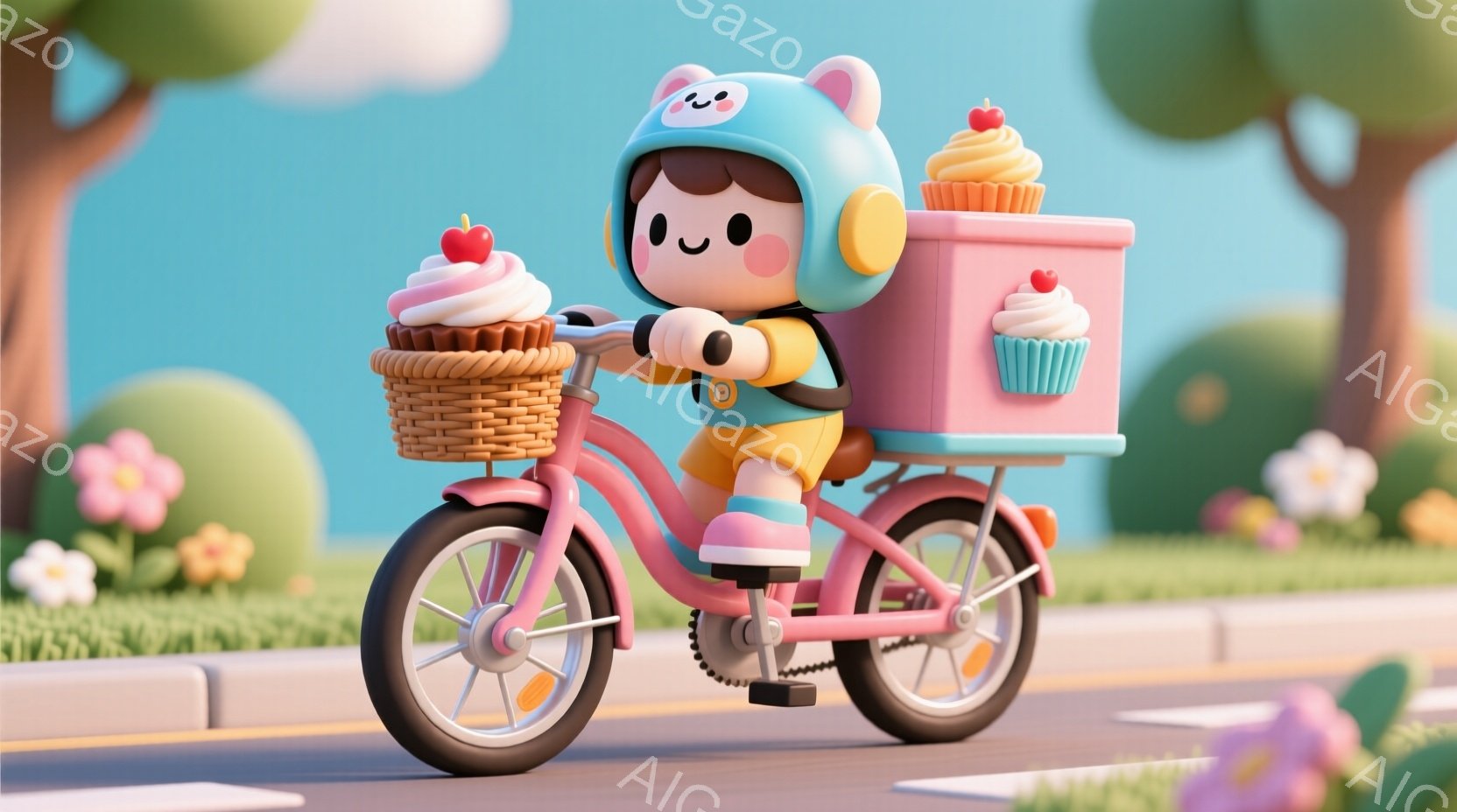 この無料AI生成画像「白いウサギのキャラクターが、ピンク色の自転車に乗って配達をしている様子が描かれています。ウサギは水色のベストを着ており、かごにはクリームとイチゴが乗ったカップケーキが入っています。背景には緑の芝生と木々が見え、晴れた日の穏やかな雰囲気が漂っています。」は、2025年10月23日に作成されました。 サイズは 1664×928px の高解像度で、商用利用も可能なフリー素材として提供しています。