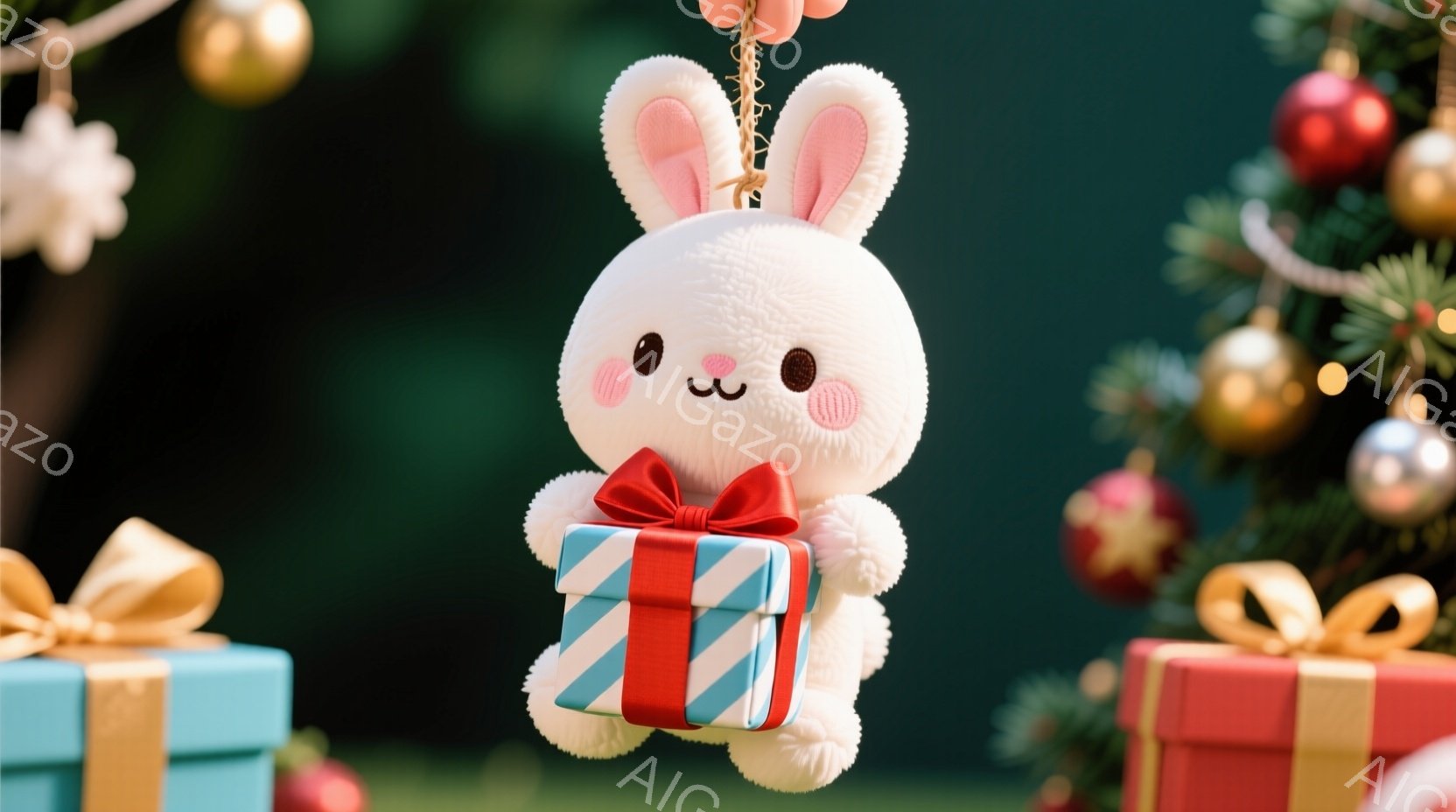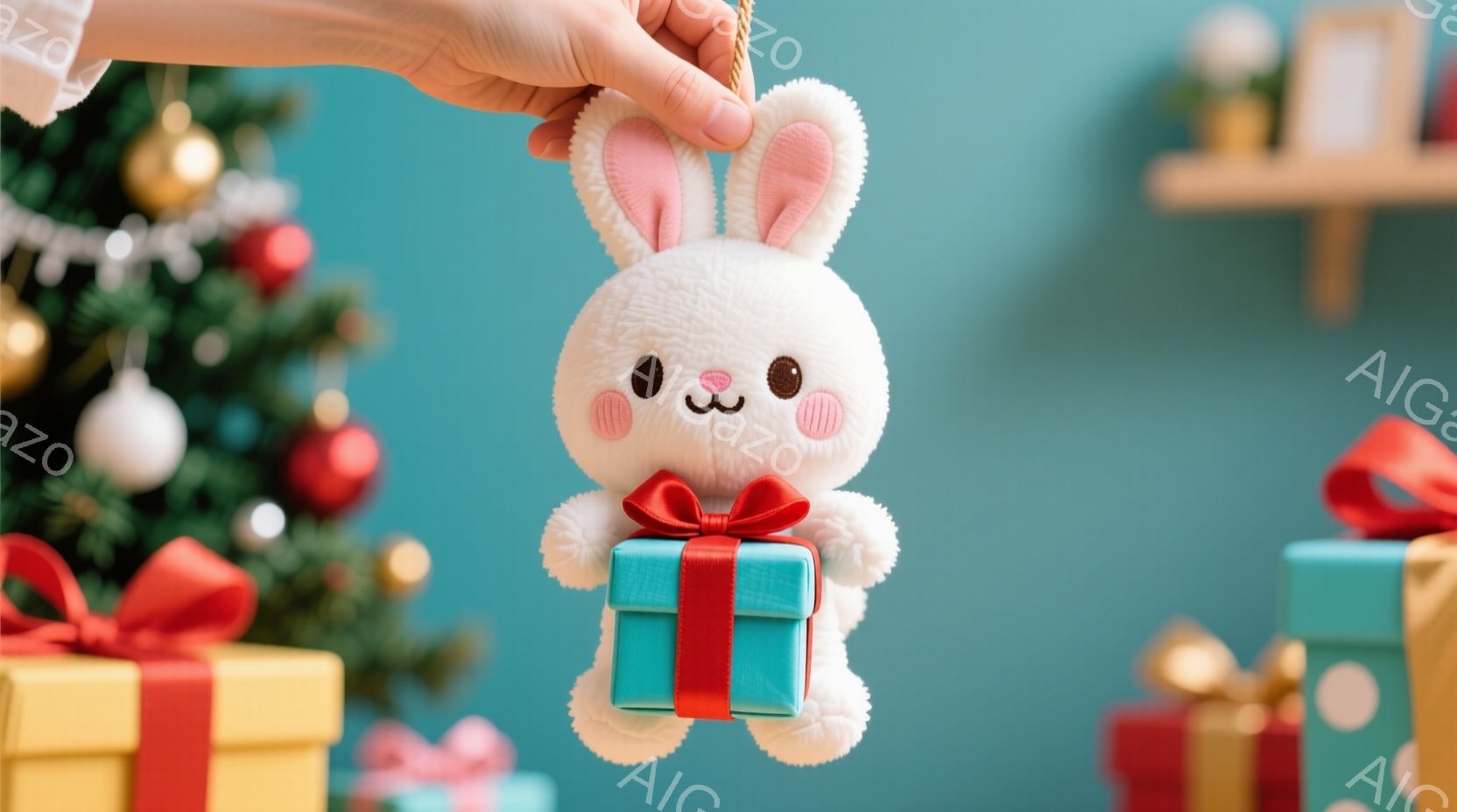 白いふわふわのウサギのぬいぐるみが、赤いリボンがついた小さな青いギフトボックスを抱えています。背景には、緑色のクリスマスツリーと、リボンで飾られたさまざまなギフトボックスが並んでいます。全体的に暖かく、お祝いムードの漂う、可愛らしい雰囲気です。